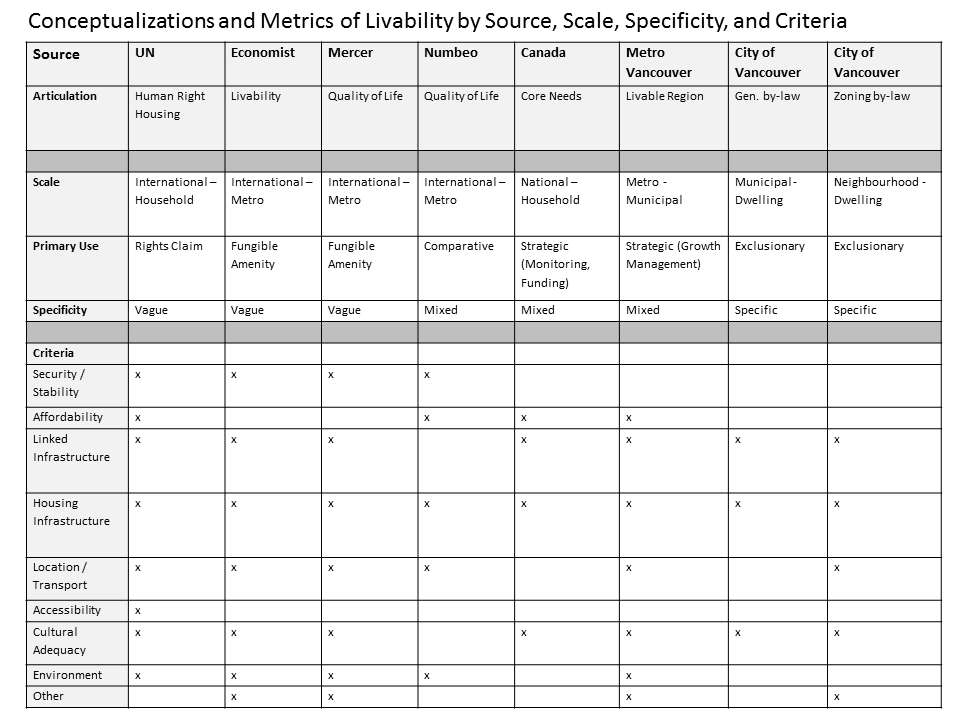 I explored conceptualizations and metrics of livability across different scales and agencies, moving from the United Nations articulation of housing as a human right (with origins in the Habitat ’76 conference right here in Vancouver!) through the various international rankings of livability (Economist, Mercer, Numbeo) that often rank Vancouver near the top (except Numbeo), through the nation-state of Canada (that relies upon Core Housing Need as its key measure of livability as it applies to housing) to Metro Vancouver and its Livable Region strategy (again back to the 70s!) to the City of Vancouver and its by-laws specifying livability as it pertains to housing via minimum dwelling standards (applied to the whole city) and even more hyper-local zoning standards (applied lot by lot). I compared all the ways livability gets conceptualized, articulated, and put to use, as well as all the different dimensions captured by each conceptualization. Like I said, fun! Here’s the big takeaway table: