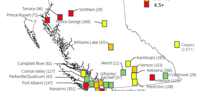 Not really. A few communities (e.g. Nanaimo, Williams Lake, Vernon) move down a category, but we don’t see major shifts, which is encouraging. Still lots of caveats remain with respect to the data: is the quality the same across communities? How do count methods differ? Check the reports for these and other details, and by all means have a look at the reports and play with the data yourself! I’ll park my little excel datasheet here in case anyone wants to check my work or use it.