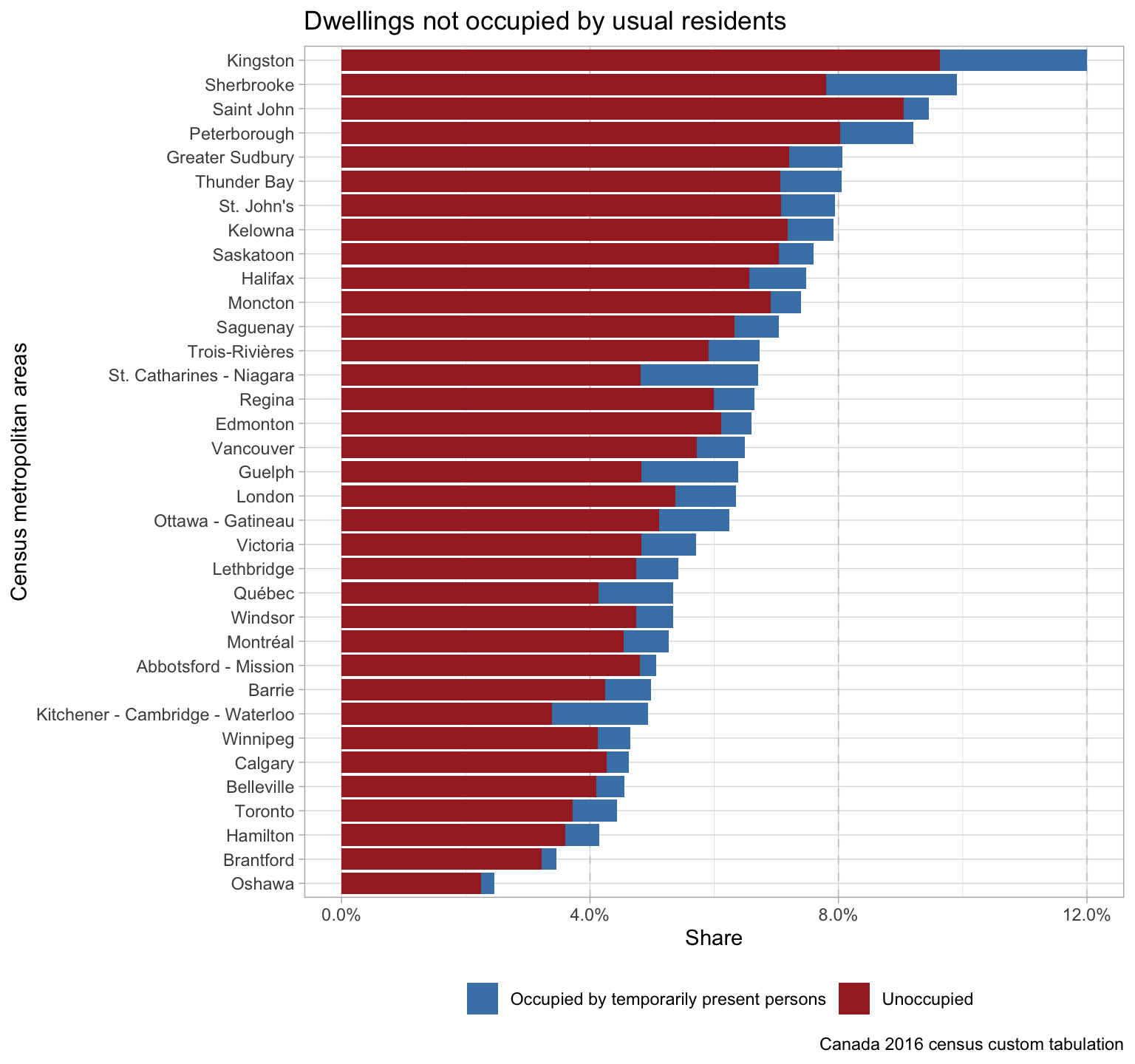 Canadian data is pretty simple. To start off we look at Canada’s major census metropolitan areas by their share of unoccupied dwellings. For context we also show the temporarily occupied units. We get a range of unoccupied households somewhere between roughly 2% and 10%, with most bigger metros hanging toward the middle, between 4% and 8% (or what the Lincoln Land Institute considers the desirable range of “reasonable vacancy”).