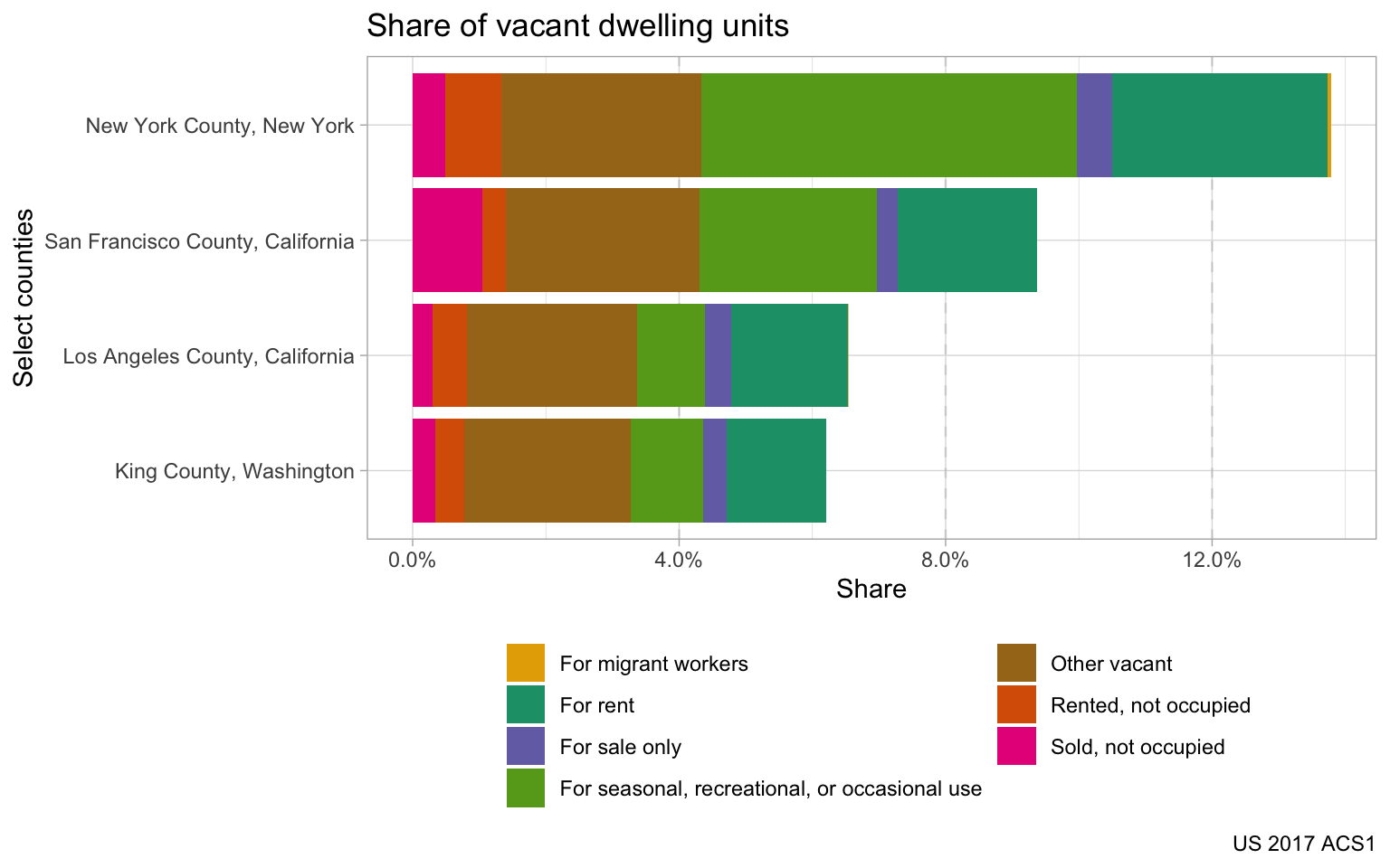 US data on unoccupied homes is available from multiple places. Here we use the American Community Survey as similar to the Canadian Census. (But see also the American Housing Survey for fun cross-referencing).