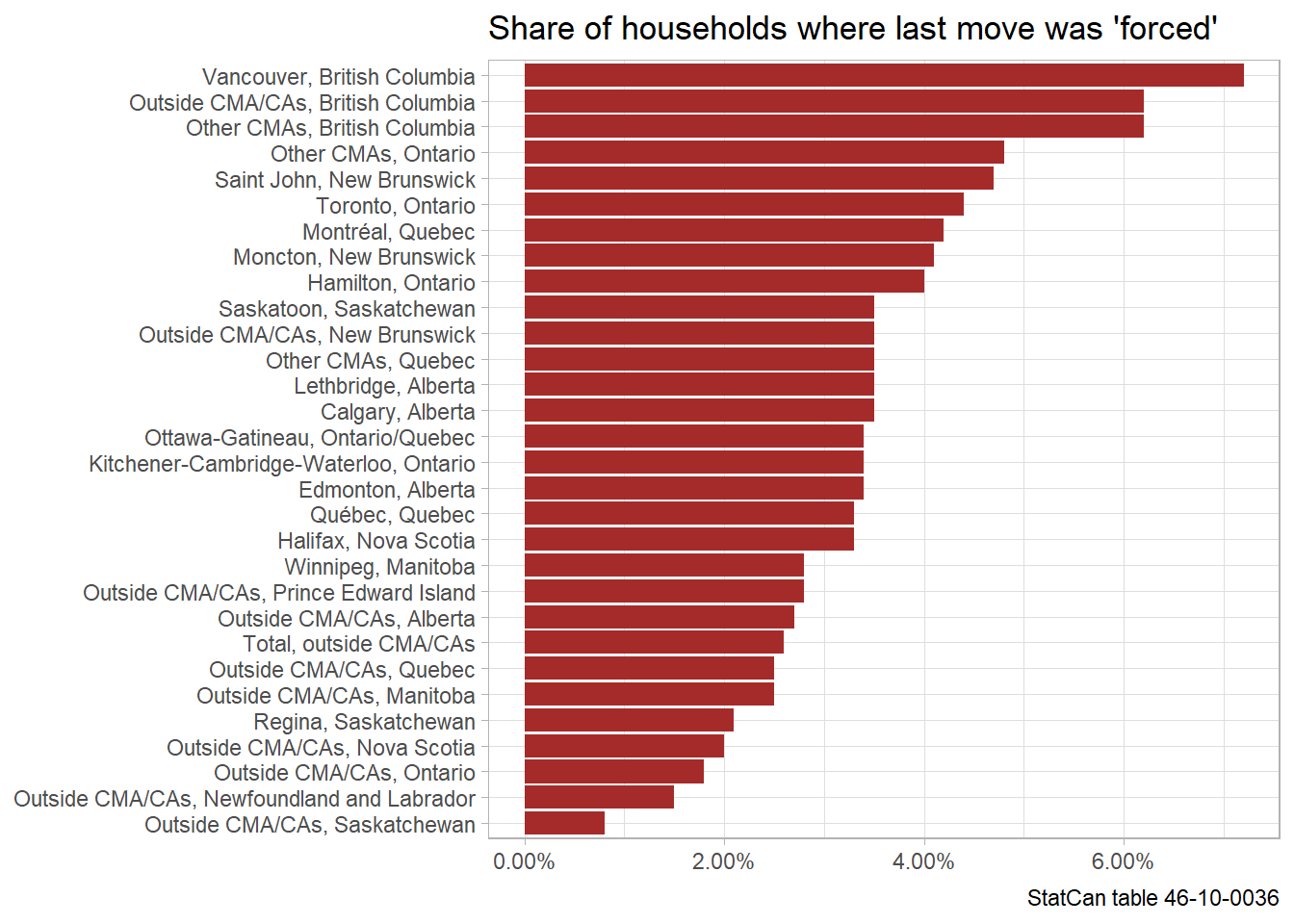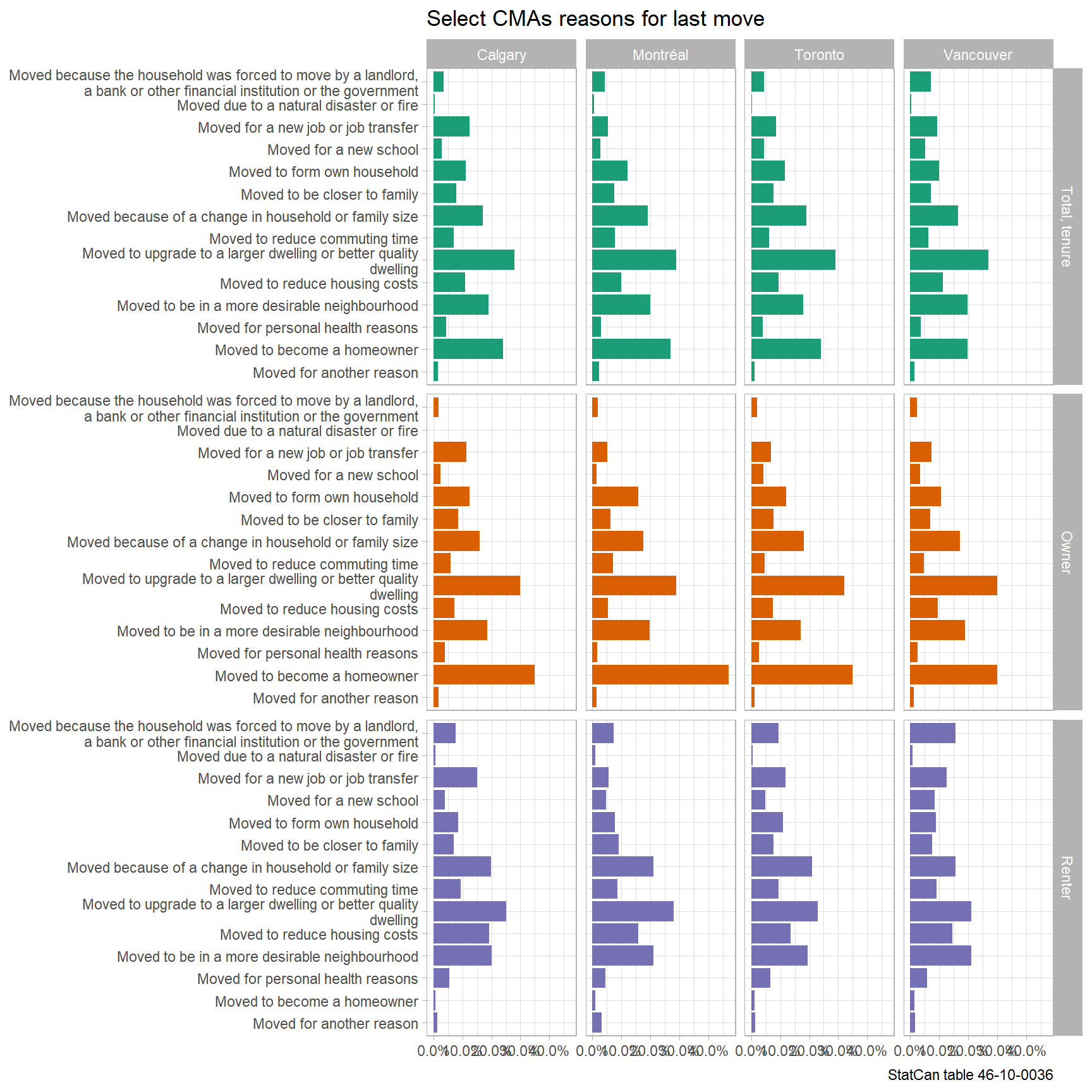 Last time we only got provincial results. Now we can break down reasons for the last move by metro area and current tenure, but this time around we looking at the last move no matter when it happened, as opposed to only considering moves in the past five years as in the previous data release. So the stats aren’t directly comparable to the numbers from the previous release. But as we’ll show, the trends are pretty similar.
