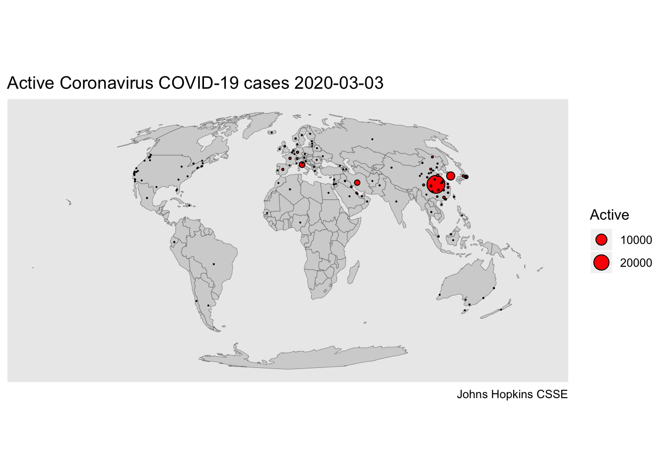 Wuhan, of course, appears as the centre of the outbreak, and Hubei Province in China contains most of the active confirmed cases to date (as of March 03, 2020!) The number of cases is important to track, obviously, and the starting point for healthcare workers and epidemiologists alike. But focusing on these numbers can provide a misleading impression of how widespread the Coronavirus has become. So let’s come up with a crude estimate of prevalence instead of case numbers. Here we’re going to use active confirmed cases as our starting point. Another option is to track all confirmed cases, including those who have recovered (no longer testing positive) or died from coronavirus. But active confirmed cases might arguably give us a better sense of current spread.