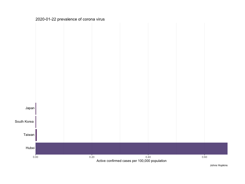 We can plot the evolving nature of active confirmed cases in terms of prevalence estimates across places, effectively dividing total number of active confirmed cases by population for our data reported so far. Setting this to motion, we can track outbreaks by prevalence across time. Even just looking at active confirmed cases, we get a sense that recorded prevalence has recently stopped climbing for Hubei province. Meanwhile, outbreaks in South Korea, Iran, Hong Kong, and the nearby state of Washington continue to grow. Also worth noting, some countries (e.g. South Korea) seem to have a better handle on testing the virus, providing better confidence in their numbers. The numbers coming out of other locales (Iran and the USA) seem far less reliable, either because of inconsistent testing, untrustworthy reporting by officials, or both. This sets a real limit on what we can know so far.