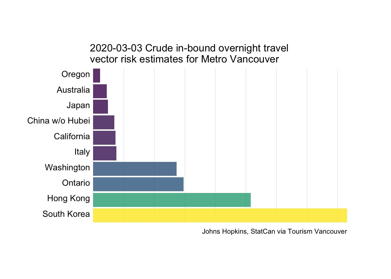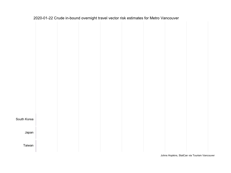 Here we can see rapidly changing vector possibilities. Conditions are changing fast! Still, it’s hard to know how much to trust these numbers. Given what we understand about testing at the moment, it’s likely we’re still overstating the risk from high quality testing locales (South Korea), as well as understating the risk from places where testing has been poor (Washington) and places where we don’t have any visitor data at all (Iran). We’re also missing current data on how travel is changing as well as data on where people from Metro Vancouver are traveling, which is a big deal given that most of our cases so far represent returned travelers from abroad.