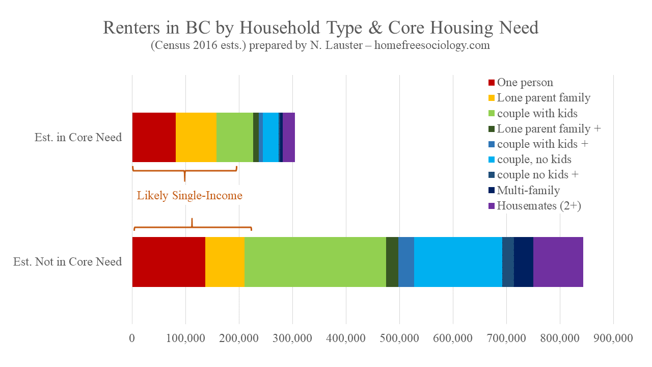 If we look at renting households in core housing need (before the crisis), most were likely single-income earning households. Single-person households will do the same in the present crisis regardless of whether the $500 rental benefit applies per tenant or per unit. But a lot of renter households contain children and these are also over-represented in core housing needs. Notably, this included over half of all single-parent households in BC even before the COVID crisis. If the benefit applied per tenant and actually included children, it might go a long way toward diminishing the immediate crisis besetting many single parents. It might also assist couples with children, whether they’re reliant upon a single income or not.