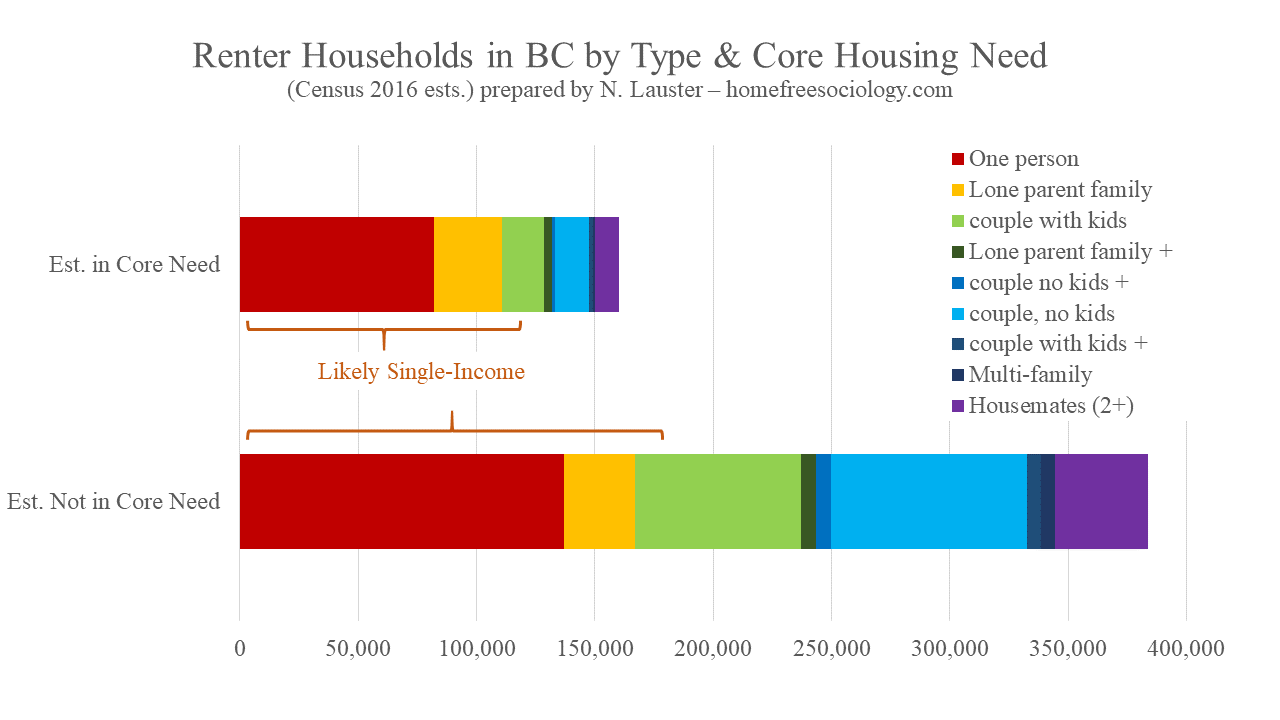 One way of looking at the government position on rentals is that couples might be considered more resilient than singles. So singles, including roommates as well as single parents (who get $500), need more help and more allowances. And as I wrote previously, with respect to rental supports this might well be correct. Singles and single parents make up the bulk of those in core housing need. I’m happy that the BC government is providing special help to those with dependents, even if I wish the amounts were higher.