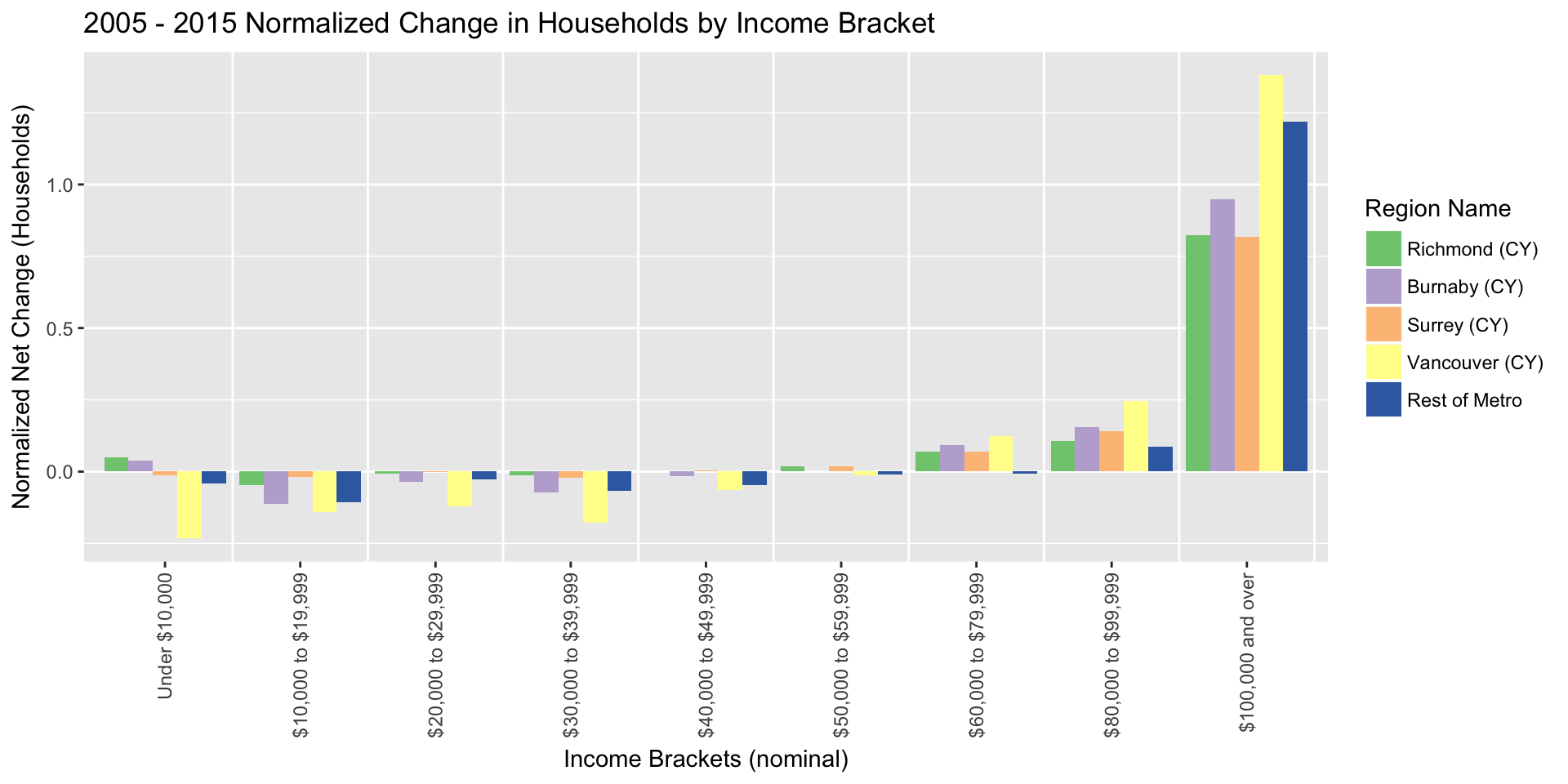 Is this the kind of thing that could happen in Vancouver? Before we get into the motion, let’s just quickly look at Vancouver’s recent past. We know prices and rents rose rapidly through 2016 (and beyond), which is pretty good evidence that we didn’t add enough housing for the people who wanted to live here all by itself. But how did the City of Vancouver grow relative to the rest of the region? It grew more slowly. (“No thanks! We’re full!”) Did we lose poor people and replace them with rich people as a result? Yap, this is exactly what has happend in the City of Vancouver, which has lost lower and middle income people, and gained high-income people, at a faster pace than the surrounding Metro area.