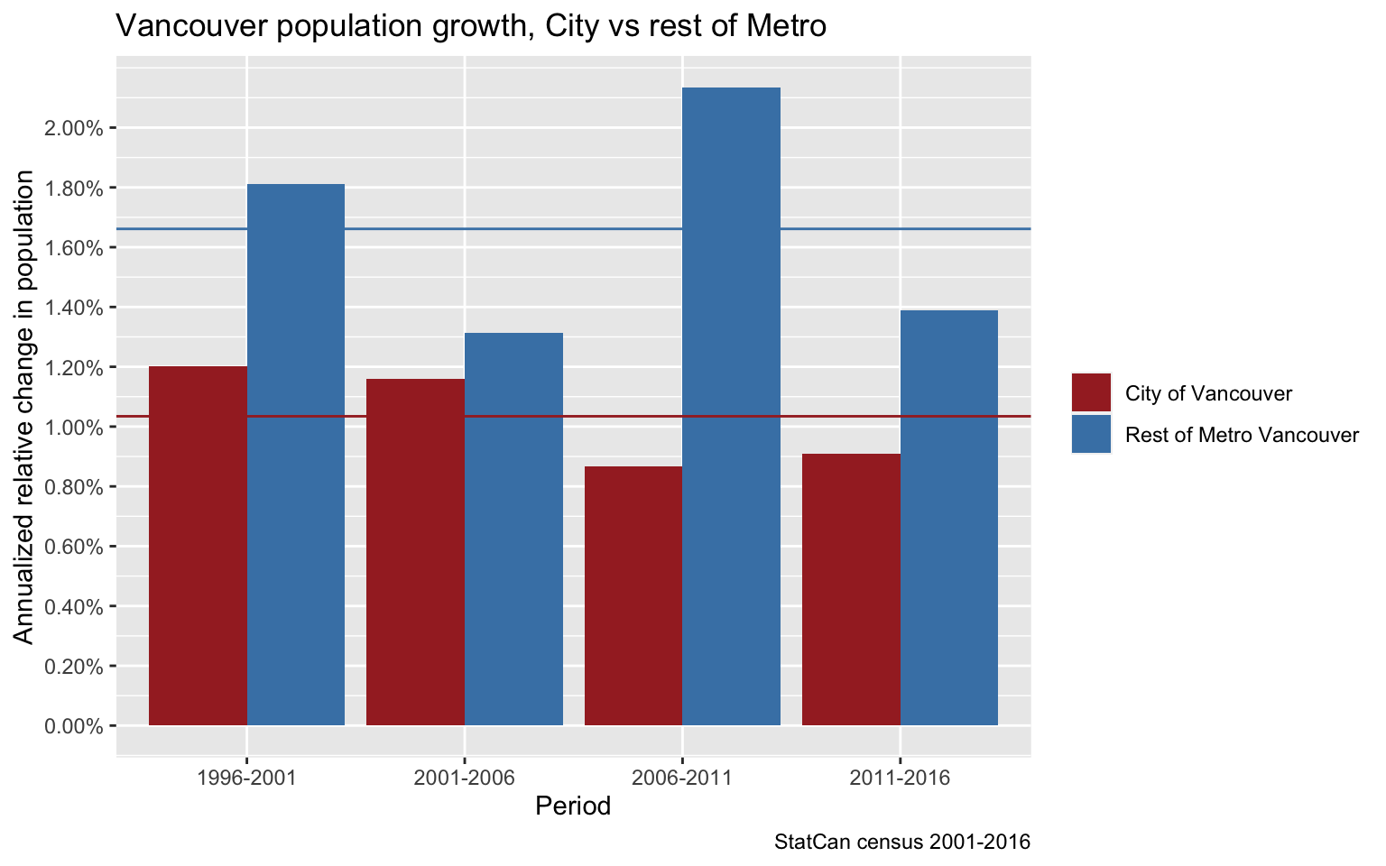 And population in the City has grown consistently at a lower rate than overall Metro Vancouver population. In fact, if the City of Vancouver had grown at the same rate as Metro Vancouver over those 20 years, Vancouver would have had 60,000 more people within city limits in 2016. But maybe people would just rather live farther out in the surrounding suburbs? Again, there are variations, but overall that is not what the price and rent data tell us.