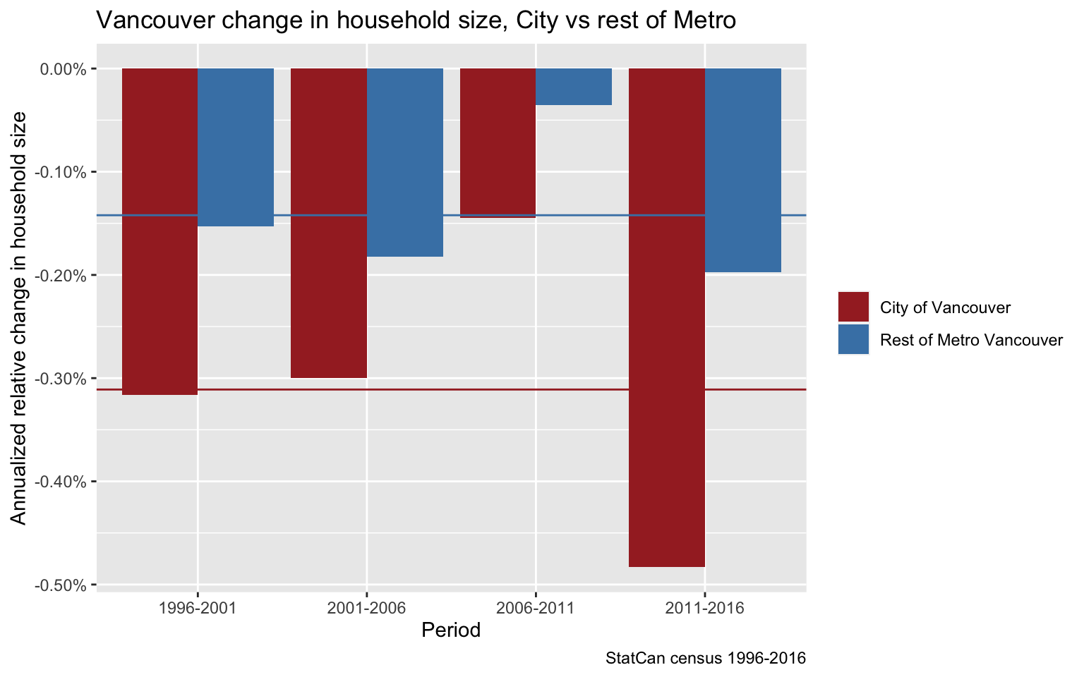 What about household size? The motion suggests imposing a constant for Vancouver, expecting 2.2 people per household. But household size is not staying constant. It’s falling all across Canada, due to a combination of forces (aging of the population, declining childbearing, changes in partnership, the rise of people living alone). We also know that as people get richer, they tend to occupy more space. And, as pointed out above, Vancouver’s been getting richer.