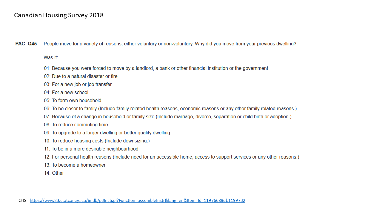 There are a few major differences in these questions which I’ll detail in a moment, but one is worth talking about insofar as it’s especially subtle given its possible impact. Researchers often think of two separable but related processes as involved in moving. There are the “push” reasons you might leave a home and the “pull” reasons that might draw you to a new one. Reading the different questions carefully, the CPS clearly cues for “pull” reasons in specifying “reason for moving to this house.” The implicit comparison is “as compared to some other house” you might’ve moved to, rather than “why did you leave your old house.” The AHS more neutrally refers to moves overall, letting respondents sort through push or pull factors relevant to each option. I’ll come back to why this might be importantly in a moment. First let’s jump over to the Canadian Housing Survey question, which asks the responding member of each household about their previous residence and the move to their current residence, no matter how long ago it occurred.