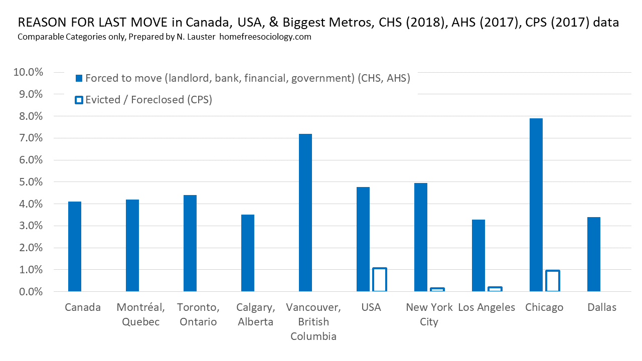 I’ve written about “forced moves” before, with special attention to those relating to landlords, banks and other financial institutions, and government actions in Canada and evictions and foreclosures in the USA. I puzzled over the differences between Canadian (CHS) and American (CPS) data. But looking across all surveys, we can see that the CHS and AHS data actually look very similar. It’s the CPS that seems to report an unusually low percentage of evictions and foreclosures rather than forced moves. So what’s happening? If one were reporting only the main “reason for move,” it would seem like being forced out of one’s previous residence would rise to the top, so it’s probably not just a matter of choosing a single “main” reason vs. multiple reasons. BUT let’s remember that the CPS also conditions peoples’ choices toward “pull” factors relating to the “main reason for moving to this house.” So CPS respondents are likely drawn toward considering why they ended up in their current residence, as opposed to other possible places they could’ve moved, rather than reporting on why they left their old place. Like I said, it’s a subtle difference in question wording, but here it probably has a big impact.