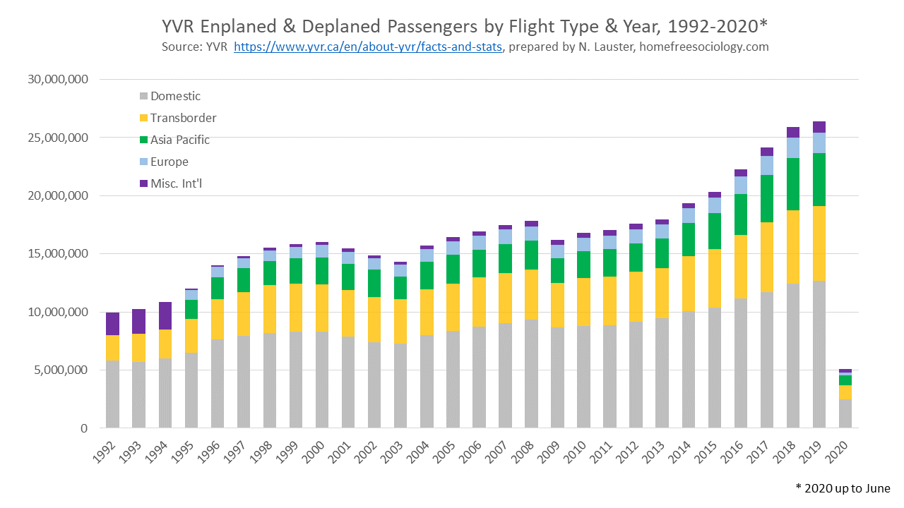 The data cover all “enplaned and deplaned” passengers, so everyone coming through YVR for air travel. They break down the passengers by domestic, transborder, and other international travel. From 1995 onward, they also helpfully break out Asia-Pacific and European passengers from other miscellaneous international. My working assumption is that passenger categories mostly mirror YVR’s organization of flight destination information, so that Domestic covers all flights within Canada, Transborder covers flights to the USA, Asia-Pacific covers flights to Mainland China, Hong Kong, Taiwan, India, the Philippines, Japan, South Korea, New Zealand, and Australia, and Europe covers flights to the EU plus the UK. Misc. Intl. covers everyone else, but probably mostly picks up flights to Mexico and the Caribbean / Central America. Of note, there’s enough ambiguity in labeling that it’s possible flights to Mexico fit in the Transborder category instead, but I’ll assume we’re just talking about the immediate border there.
