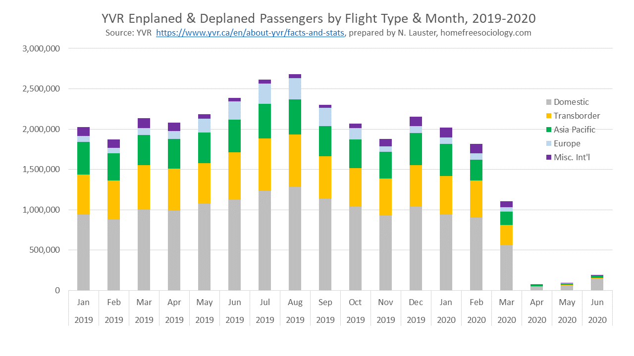 We can see that the biggest recovery, so far, is in the Domestic category. Not surprising, given that the provinces have lifted most of their quarantines against travel within the country. Canada continues to impose a travel restrictions for other international travel. But the next biggest recovery is for flights between Vancouver and Asia Pacific, where COVID recoveries so far tend to look the strongest. Misc. Int’l flights, continue, but travel to the US and Europe remains almost non-existent. At least as of June (Europe began lifting travel restrictions in July). Of note, of course, we’re still experiencingair travel related exposures (h/t Jens).