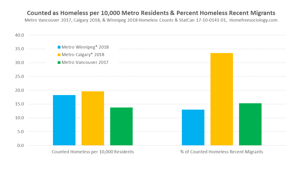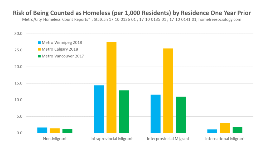 - Methodological note: While the Metro Vancouver count covers the entire metro area, the coverage of the Calgary and Winnipeg counts may be more constrained to the central cities of each metro area. This may result in a slight conservative bias, undercounting those who would show up in a homeless count in Calgary and Winnipeg covering the entire metro areas involved. At the same time, Calgary and Winnipeg dominate the populations of their metropolitan areas in a way which Vancouver, as a central city, does not. So I use metro populations as denominators in all cases in assessing the relative prevalence of homelessness in those cities relative to general populations and migration streams. I obtain comparative statistics on metro areas via StatsCan Tables 17-10-0136-01 ; 17-10-0135-01 ; 17-10-0141-01 for homeless count reference years, or, in the case of estimating migration-based risks, for the periods leading up to reference years. I use the data to estimate populations of non-migrants (stayers & local movers), intraprovincial, interprovincial, and international migrants for each metro to use as baselines for establishing risk of showing up in homeless counts. All data and calculations are available in this spreadsheet. Please send any corrections or questions my way!