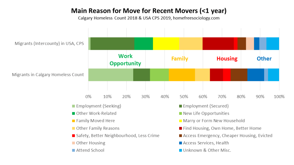 The options are worded differently in places, but I’ve attempted to harmonize them as possible, and the correspondence is pretty clear. Main reasons for move fit into the same four broad categories (work & opportunity, family, housing, other) for those who end up homeless in Calgary as for all movers in the USA, and in roughly the same proportions. Where responses differ, they tend to indicate that migrants who end up counted as homeless are taking slightly bigger risks than migrants overall. For instance, fewer people who ended up homeless in Calgary moved with a job already secured, compared to those who moved looking for work. But overall, the patterns suggest that people who move and then show up in homeless counts seem to move for pretty much the same reasons as everybody else.