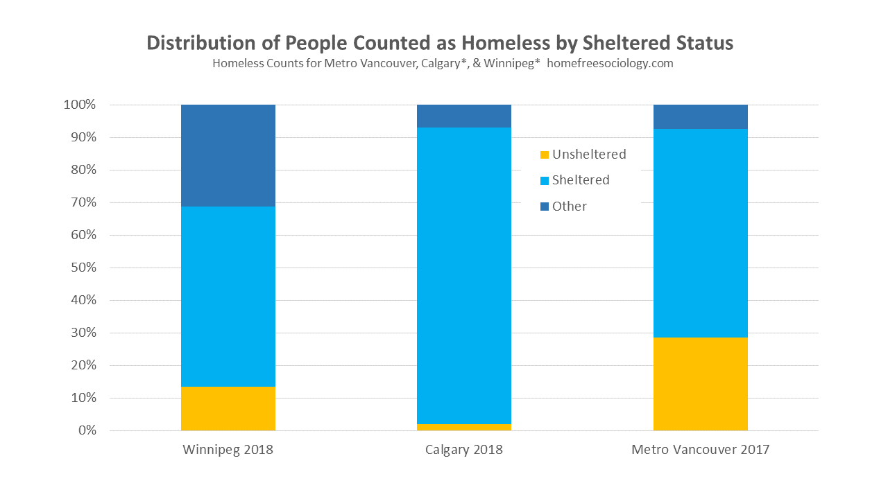 From here on out, I’m going to set aside these portions of the argument and turn my attention toward a few of the empirical claims. Correspondingly, I’m also going to focus at the metropolitan level in terms of thinking about migration and homelessness, meaning I’m setting aside how people counted as homeless, as well as supports and services, are distributed within metro areas (my position, again, is that we need more housing, supports, and services, and every neighbourhood should have them). For the rest of this piece, I’m mostly going to return to my starting question: how should we interpret what homeless counts tell us about people who move? And I’m mostly going to do it by comparing patterns of migration as they show up in homeless counts in Metro Vancouver to Calgary and Winnipeg.