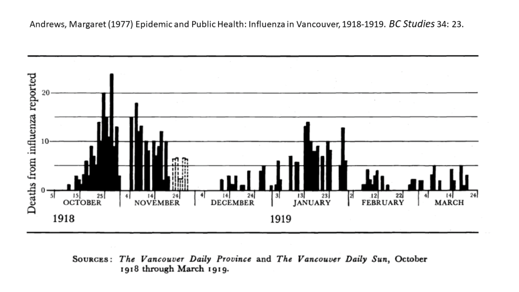 First, a couple of quick notes about the 1918-1919 Pandemic, brought to you by Margaret Andrews (1977) enlightening research in “Epidemic and Public Health: Influenza in Vancouver, 1918-1919” open access in BC Studies vol. 34. According to Andrews, the Pandemic hit Vancouver especially hard relative to other cities in Canada and the USA. It was also very different from today’s Pandemic in targeting mostly young and middle-aged adults.