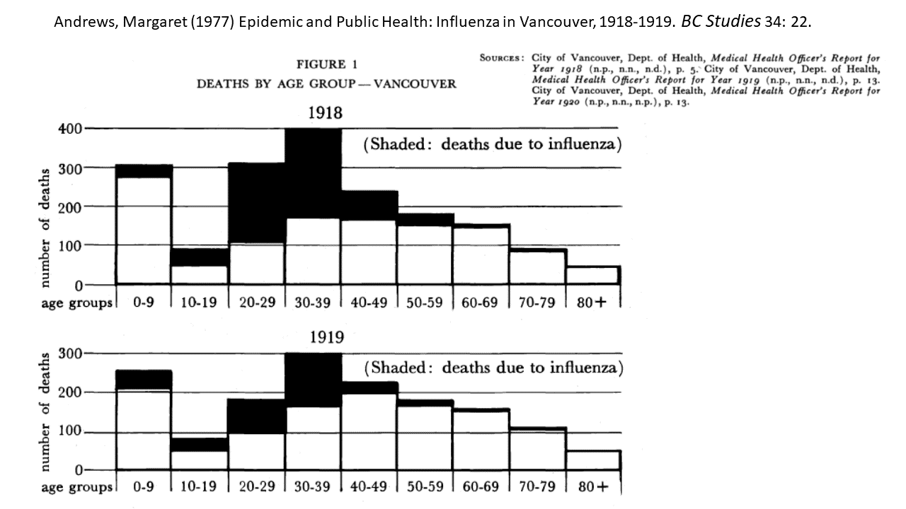 First, a couple of quick notes about the 1918-1919 Pandemic, brought to you by Margaret Andrews (1977) enlightening research in “Epidemic and Public Health: Influenza in Vancouver, 1918-1919” open access in BC Studies vol. 34. According to Andrews, the Pandemic hit Vancouver especially hard relative to other cities in Canada and the USA. It was also very different from today’s Pandemic in targeting mostly young and middle-aged adults.