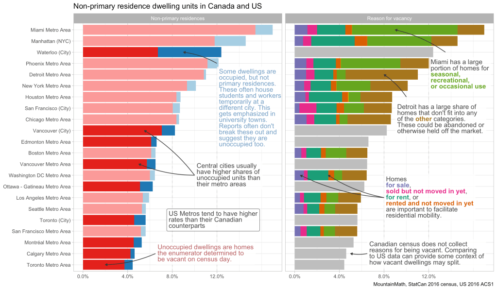 Vancouver and Ottawa appear high for Canada, but somewhere between low and middle-of-the-road for North America as a whole. Toronto is definitely on the low end. Of note, a scan of the data for the US, which includes reason for vacancy, suggests that regular housing processes (dwellings up for sale or rent, awaiting new residents; dwellings caught in temporary legal limbo after the death of an owner, etc.) account for a substantial portion of vacant homes overall. For metros at the high end of vacancies, these numbers are boosted by abandoned homes and/or pied-a-terre vacation homes. This suggests that abandoned homes and pied-a-terres just aren’t that common in Canada.