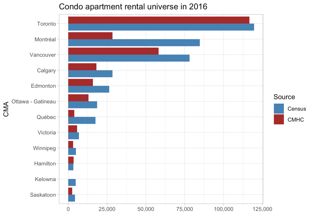 Of course, taxes may be bringing dwellings back into the rental market that weren’t there in 2016, meaning our EHT and SVT data might be reflecting big declines in empty units. What about that CMHC study showing a bump of condos being rented out after the Empty Homes Tax was imposed? Well, funny story… first it’s important to know that the study is based on condo managers reporting from their Form K, which are meant to be filed when condo units are rented out, but in the past have been largely inconsequential. Indeed, in previous work we have highlighted that the CMHC estimate of rented condos in Metro Vancouver differs significantly with census estimates.