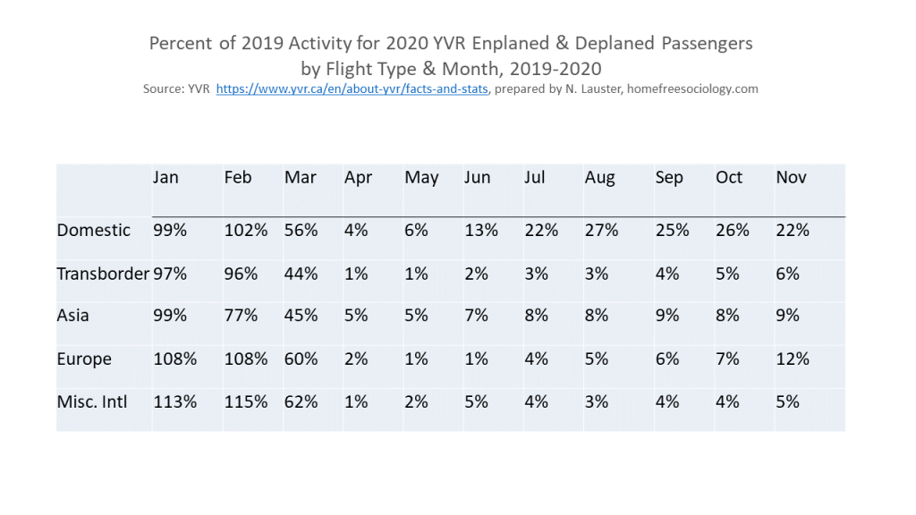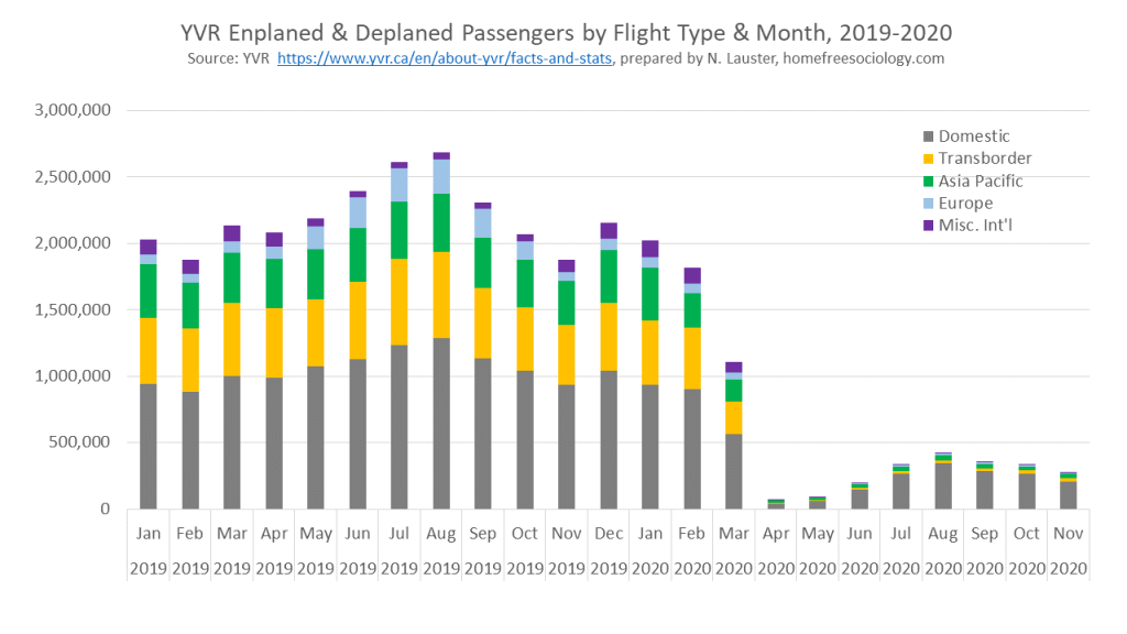 International travel patterns are different, and more than a little troubling, insofar as they don’t seem to be at all responsive to the second wave of COVID. Though the progress has been much slower than for Domestic travel, International travel just keeps rising back toward historic norms, led, in November, by a sharp jump in travel between YVR and Europe. Yikes.