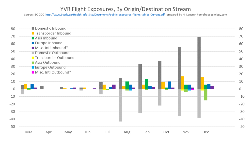 Still no updated YVR passenger data for December! But lots of discussion about travel restrictions. So I’m posting a comparison of BC CDC flight exposures to overall exposures by month below, running up to January 22 (latest flight exposure notification data). The scales are set to 1 flight exposure = 500 cases reported, though of course I make no claim for direct causality there! The figure merely enables a comparative analysis of trends.