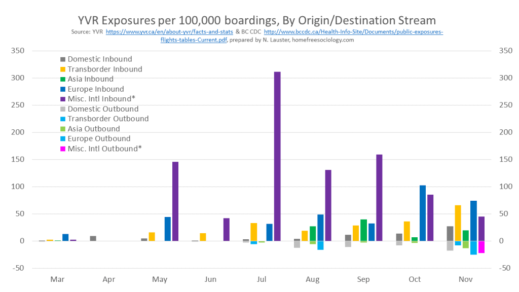 I’m not sure it’s as useful, but for consistency’s sake, I’ll also post the exposures per 100,000 passengers, which I played around with in my last post. Last time I didn’t include the Miscellaneous International flights, because there weren’t very many, but they included a lot of exposures, and also because I wasn’t entirely clear on the reporting of flights to Mexico, which is where nearly all the exposures occurred. This time I’ll add those flights back in assigned to my best guess of how to combine the data, in part because Mexico seems to be where a lot of non-essential vacationing is occurring. Unfortunately, once again, we only go up to November data. The data highlight just how risky travel to common vacation destinations in Mexico has been, especially back in July, though by November the US and Europe had moved into riskier positions. That said, the chart really obscures the steady rise in risk of exposure for domestic travelers within Canada, still representing most of our travel.