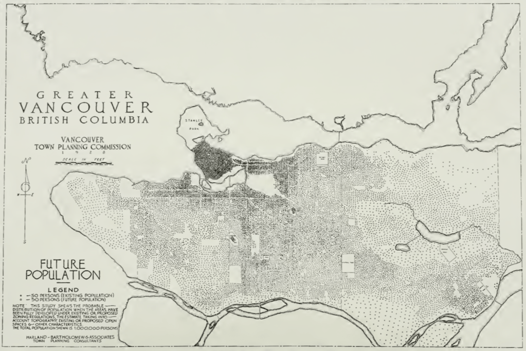 Looking forward from 1929, Bartholomew both suggested and predicted that Vancouver further amalgamate with nearby Burnaby and New Westminster, consolidating the peninsula. The combined population was about 280,000 at the time (reaching 289,681 residents by the 1931 census). Based on a variety of rudimentary forecasts, Bartholomew predicted that the peninsula containing Vancouver, Burnaby, and New Westminster would reach a population of one million residents by 1960. He even plotted out the expected distribution of this population in a lovely density dot-map on p. 94 of his report.