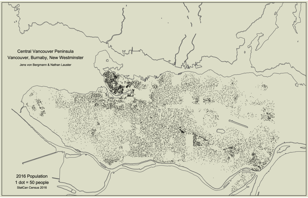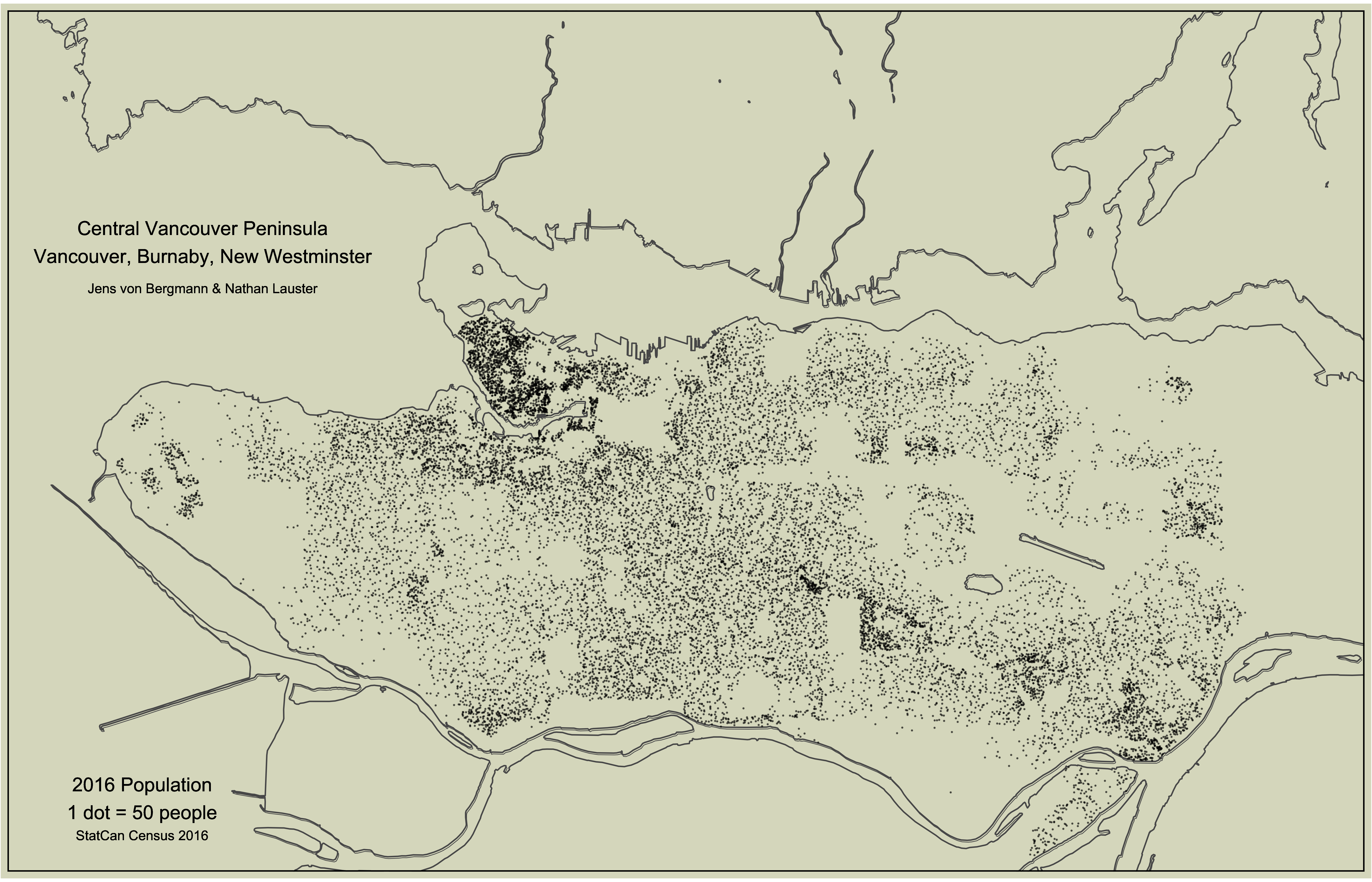 As it turned out it would take much longer than Bartholomew forecast to reach the one million mark. Indeed, we’ve probably reached it only within the last couple of years. As of 2016, Vancouver, Burnaby, and New Westminster remained unamalgamated, and together with UBC/UNA/UEL and Musqueam 2 (also unamalgamated) they totalled some 952,779 residents. We wanted to see what that distribution actually looks like today, using the same sort of dot-matrix map hand-drawn by Bartholomew’s team. Of course, we’re going to assemble it in R instead of drawing it by hand, allowing anyone to reproduce our work. Here’s what it looks like.