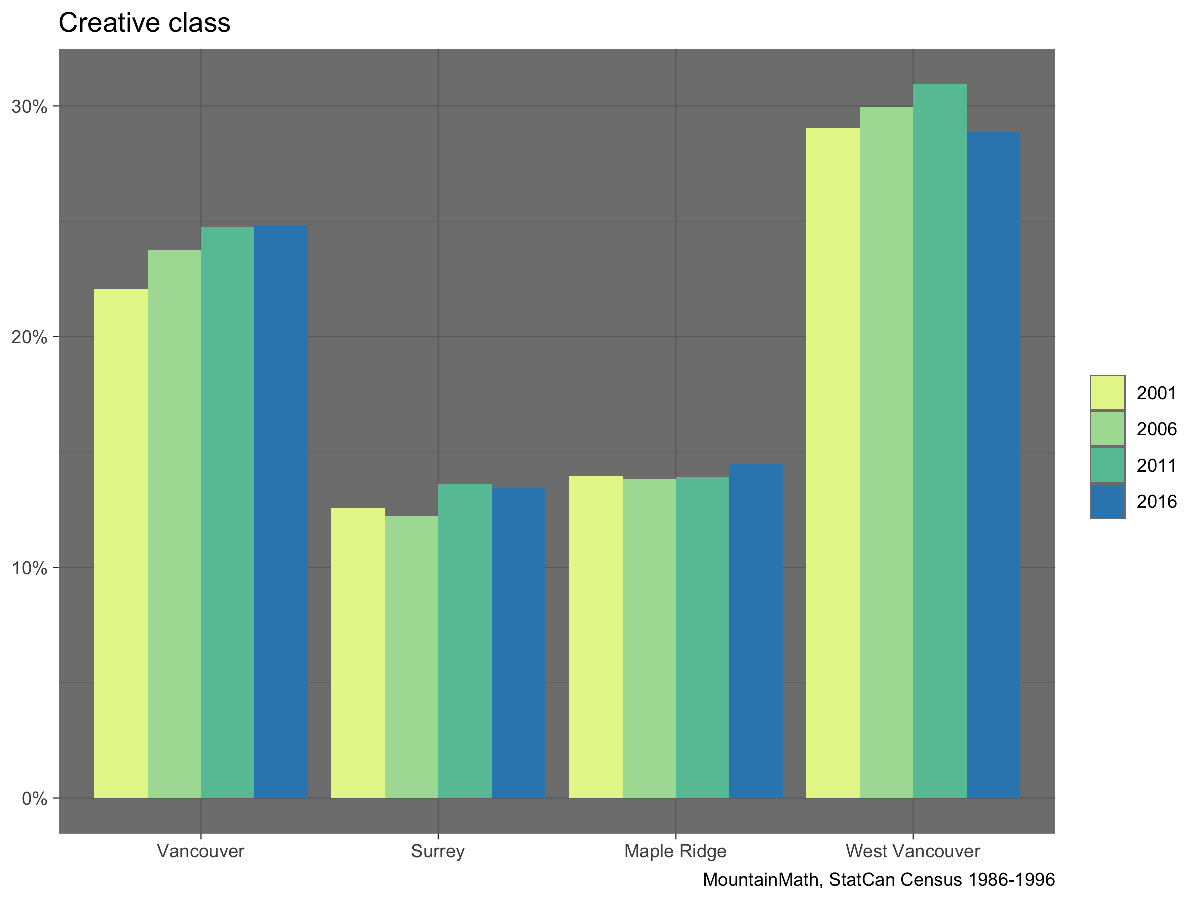 Kind of! We can see a definite rise in the City of Vancouver itself, as well as in its largest suburb of Surrey. For Maple Ridge and West Vancouver, the historical patterns are less clear, but we get a real sense of geographic sorting. West Vancouver, in particular, seems to be a place that many of our “creative class” aspire to live. At least the ones that make money.