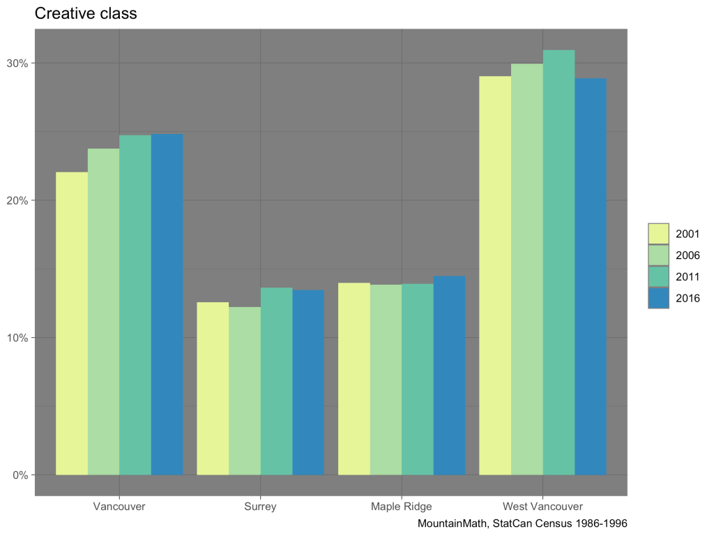 We note that in the City of Vancouver and in West Vancouver the creative class on it’s own clearly outperforms our widest possible categorization of the Real Estate related sector, whereas the situation is reversed in Surrey and Maple Ridge.