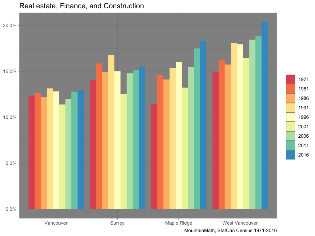 Overall, we get the sense that even this widest possible categorization of the Real Estate related sector generally provides around 15% of our municipal jobs. Fewer in the City of Vancouver and more in West Vancouver. Vancouver and Surrey show a fairly stable share of jobs in these sectors, Maple Ridge and West Vancouver show an increasing trend. The reason for the variation is diverse, Surrey and Maple Ridge have more construction workers, West Vancouver is heavier in Finance.