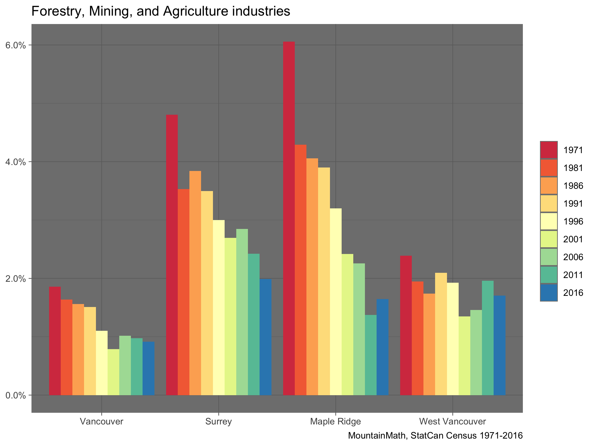 As it turns out, logging and forestry have been a very small part of Vancouver’s labour force for a long time. Indeed, in newer years this category is so small it gets lumped in with agriculture. In 1970, back when Maple Ridge remained at its most remote, it still only recorded just over 2% of its work force in the forestry industry.
