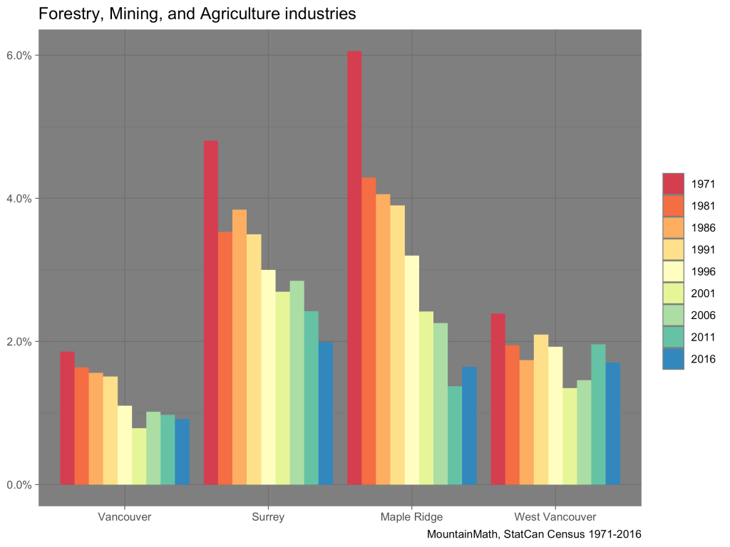 We can combine the above two industries with agriculture to get a fairly consistent picture of the combined categories through time, tracking SIC Divisions A, C, and D and NAICS 11 and 21. Together these speak to the “Staples” of the Canadian economy insofar as the country’s history has been linked to international trade. These industries have always been exceedingly small in Vancouver proper. But Surrey and Maple Ridge have seen marked declines as they’ve gradually shifted from more rural primary sites of timber and agriculture to more integrated positions as metropolitan suburbs. That said, even if the workforce remains small, the Agricultural Land Reserve insures agriculture continues to be a defining feature of the metropolitan landscape.