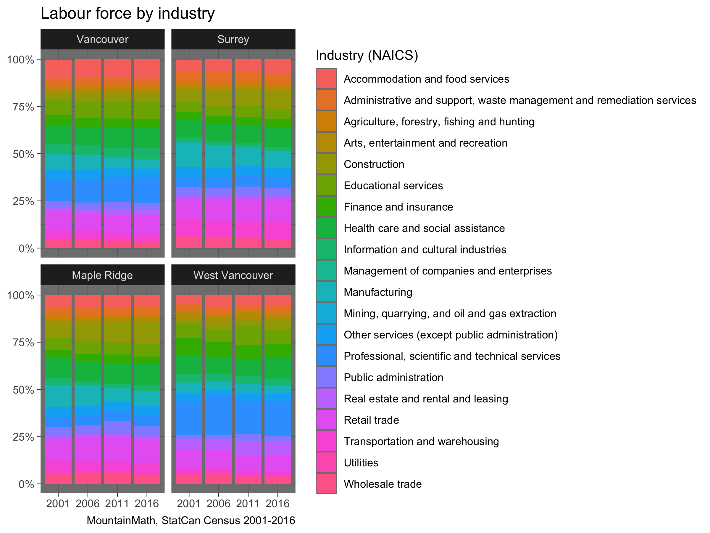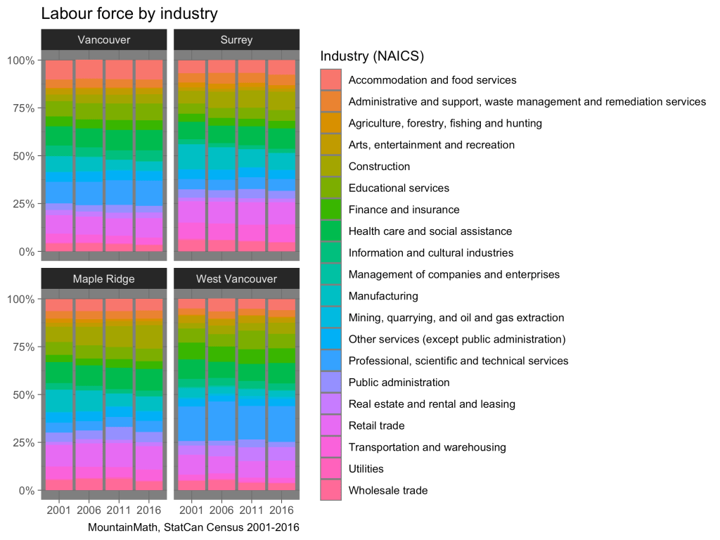But here, for jobs, we got some nice longitudinal data to answer these questions, looking at the Industrial classification of our workforce via Census running back to 1971! The biggest trick is making the industrial categories speak to our questions above and to one another across time. There were three major shifts in categories, going from SIC 1970 to SIC 1980 and finally to NAICS (and various refinements of NAICS, which are relatively minor). We can also break out interesting municipalities within Metro Vancouver. Here we’ll explore the City of Vancouver, Surrey (its largest suburb), Maple Ridge (an outlying working class suburb), and West Vancouver (its wealthiest suburb), providing some sense of geographic variation in the structuring of the labour force through time. Some of those city geographies changed through our timeframe, for consistency we will use 2016 census subdivision boundaries throughout.