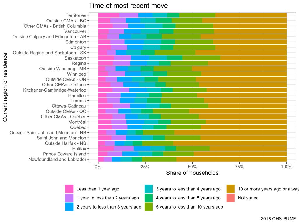 The 2018 Canadian Housing Survey (CHS) public use microdata file (PUMF) is finally out, time to dig deeper into the questions we explored when the first tables came out and the second batch on data on ethnicity and core housing need was released. The first thing we get a nice look at is how recently people moved. Within the Census, this is binned into simple “within the last year” and “within the last five years” categories. Here we get finer grained data extending up to 10 years or more. While we don’t get people’s full moving histories, this is still pretty cool insofar as we can map timing of moves to different years. The survey was fielded from November 2018 through March of 2019, so we can start there and work backward to date moves.