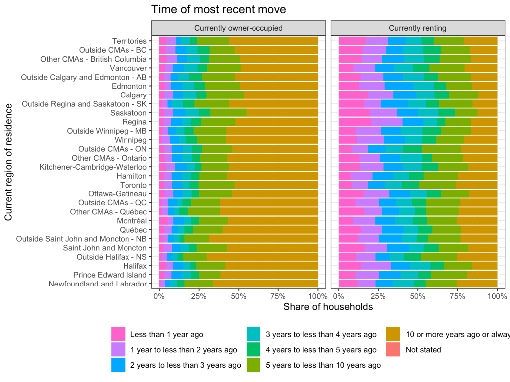 When conditioning on tenure of the current dwelling we still see slightly lower residential mobility in rural areas, but it’s reduced. The variation that remains can likely be explained by a variety of factors, like net migration and rental moving penalties. Net migration has mechanical effects on estimates of the timing of mobility for metro areas, even though most moves are local (migrants are added as movers in places where they arrive and subtracted as movers from places where they depart, boosting mobility rates in the former while decreasing them in the latter). But places where rent control maintains much lower rent for long-term tenants than new tenants (e.g. Vancouver & Toronto) tend to see renters staying in place longer, a pattern that only shows up when differentiating mobility by tenure.