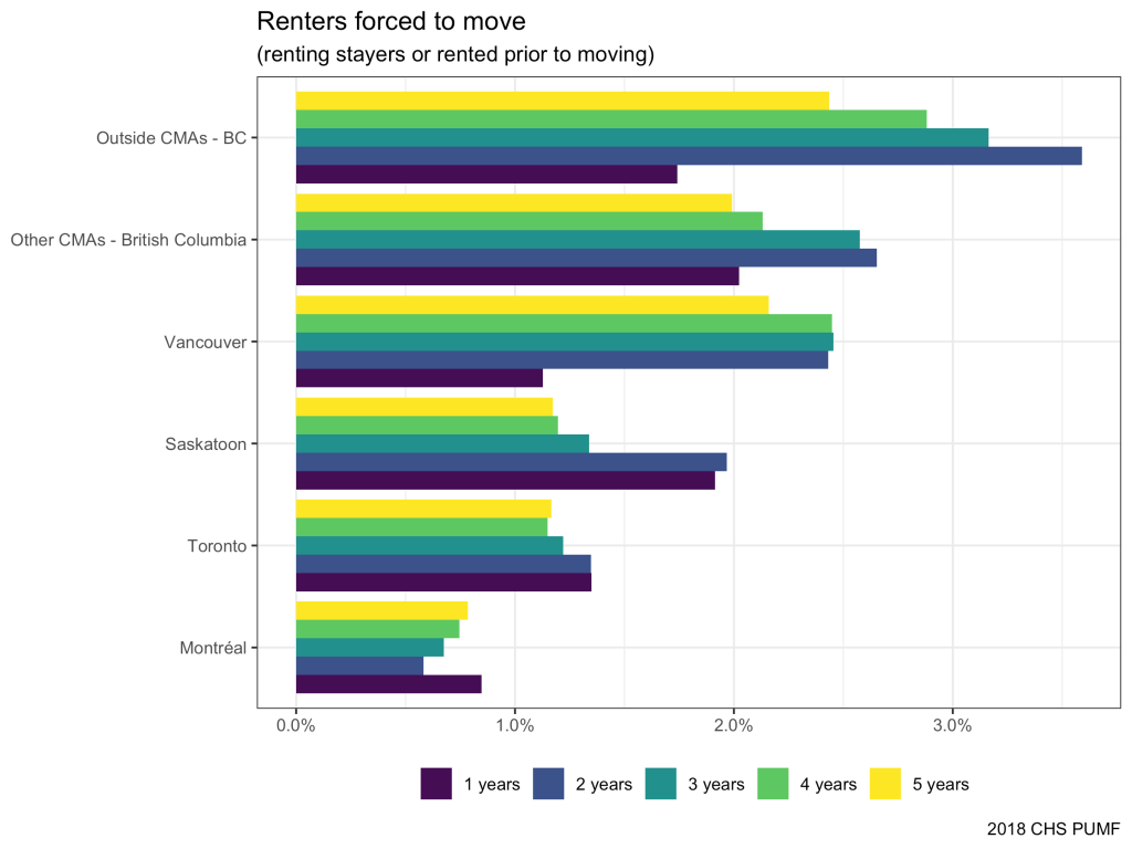 This brings out more clearly how the risk of being forced to move dropped off sharply during the last year in Vancouver and the rest of BC, but stayed roughly flat in Toronto and Montreal, and increased in Saskatoon. This lends some further credence to the hypothesis that rental protections enacted in BC had an effect on forced moves. Well done BC NDP!