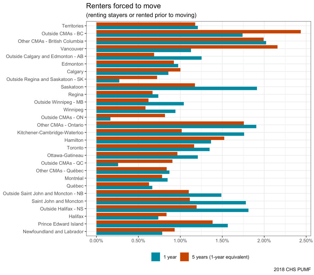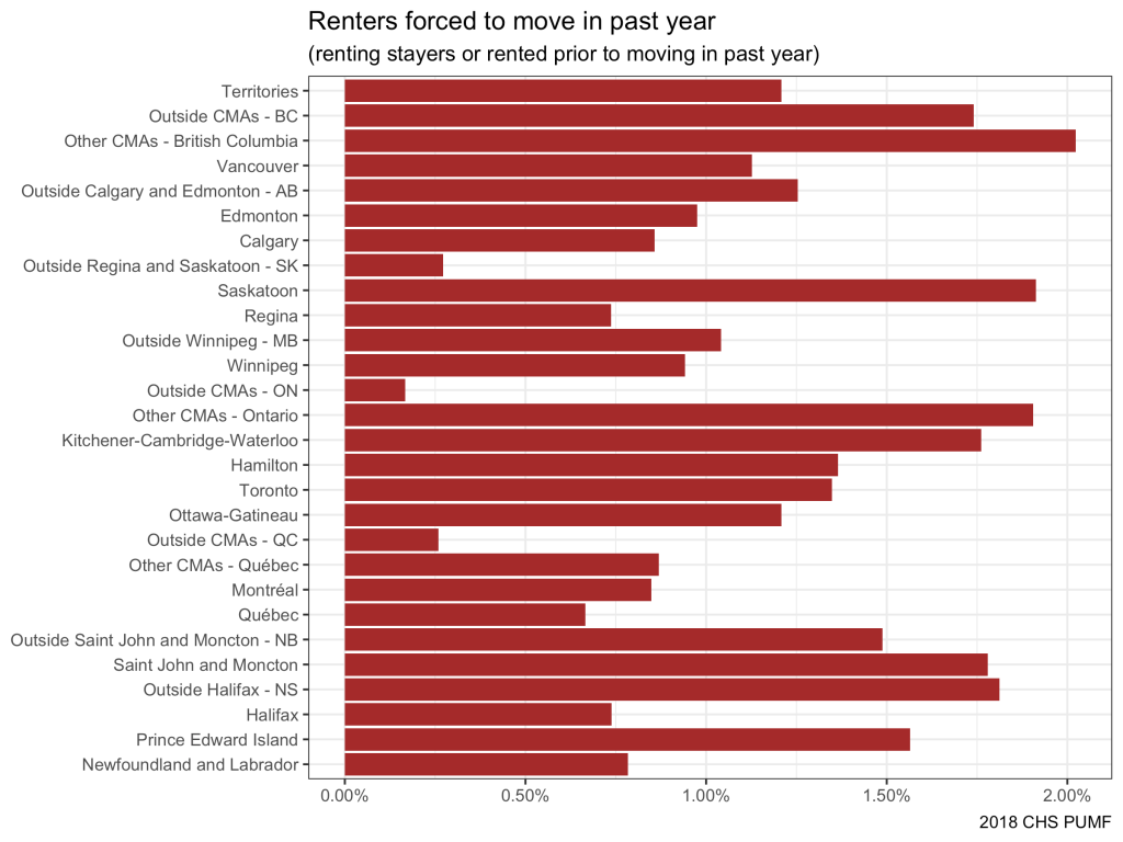 In effect, where the blue bar (one year risk) exceeds the orange bar (one-year equivalent of five year risk), we might be looking at evidence of recent historical change where risks of eviction have risen in the past year. The high risk of forced moves looks quite recent in Saskatoon, for instance. Similarly, in Manitoba, New Brunswick, and rural Nova Scotia the repeated one year risk is substantially higher than the risk of being forced to move on the last move and the last move happening during the past five years prior to 2018.