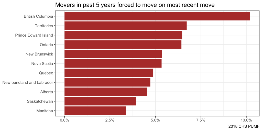 One of the (many) great features of the CHS is that it allows us to look at why people moved. Including if their move was voluntary or if people were “forced to move by a landlord, a bank or other financial institution or the government.” This allows us a closer look at power differentials as a factor in moving. In our previous posts we noted that the proportion of moves that were forced looked quite high in BC, a pattern that, with some cautions, can also be examined with reference to reason for move in US datasets. With the PUMF data we can explore in more detail who these people are that were forced to move, and what their circumstances were, as well as getting a finer geographic breakdown within BC.