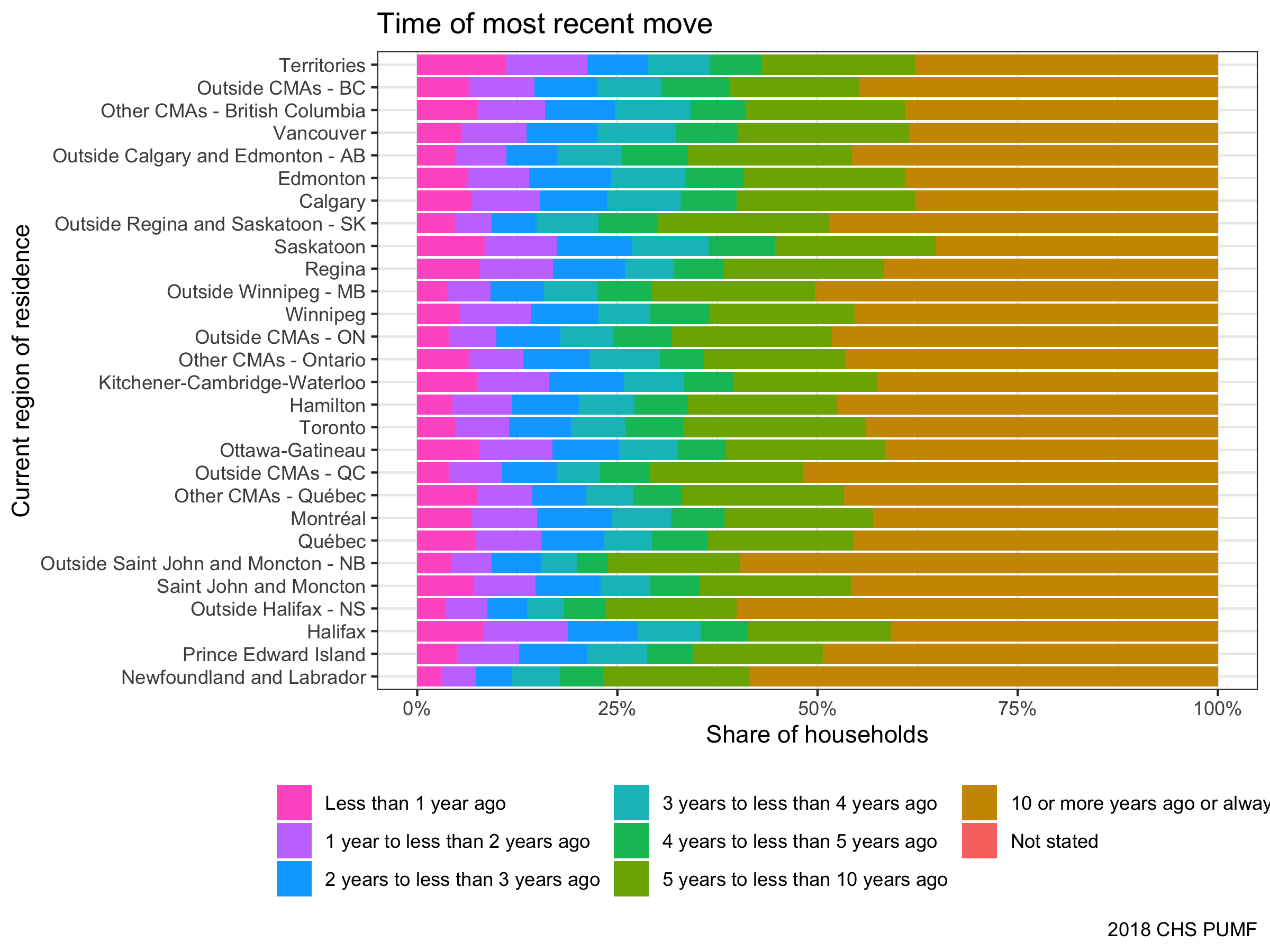 The 2018 Canadian Housing Survey (CHS) public use microdata file (PUMF) is finally out, time to dig deeper into the questions we explored when the first tables came out and the second batch on data on ethnicity and core housing need was released. The first thing we get a nice look at is how recently people moved. Within the Census, this is binned into simple “within the last year” and “within the last five years” categories. Here we get finer grained data extending up to 10 years or more. While we don’t get people’s full moving histories, this is still pretty cool insofar as we can map timing of moves to different years. The survey was fielded from November 2018 through March of 2019, so we can start there and work backward to date moves.