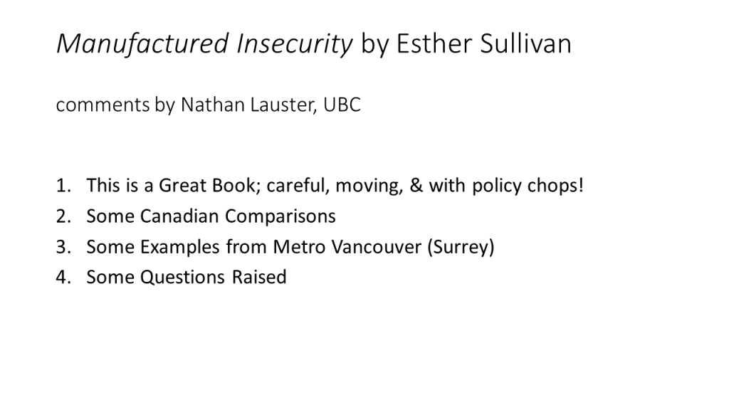 So back in the before time, by which I mean somewhere toward the end of 2019, I happily agreed to join an “author meets critics” panel at the Pacific Sociological Association meetings to discuss Esther Sullivan‘s book Manufactured Insecurity: Mobile Home Parks and Americans’ Tenuous Right to Place. The meeting would’ve been in Eugene, Oregon at the end of March in 2020. By February I was already reading the tea leaves and doubting it was going to happen.