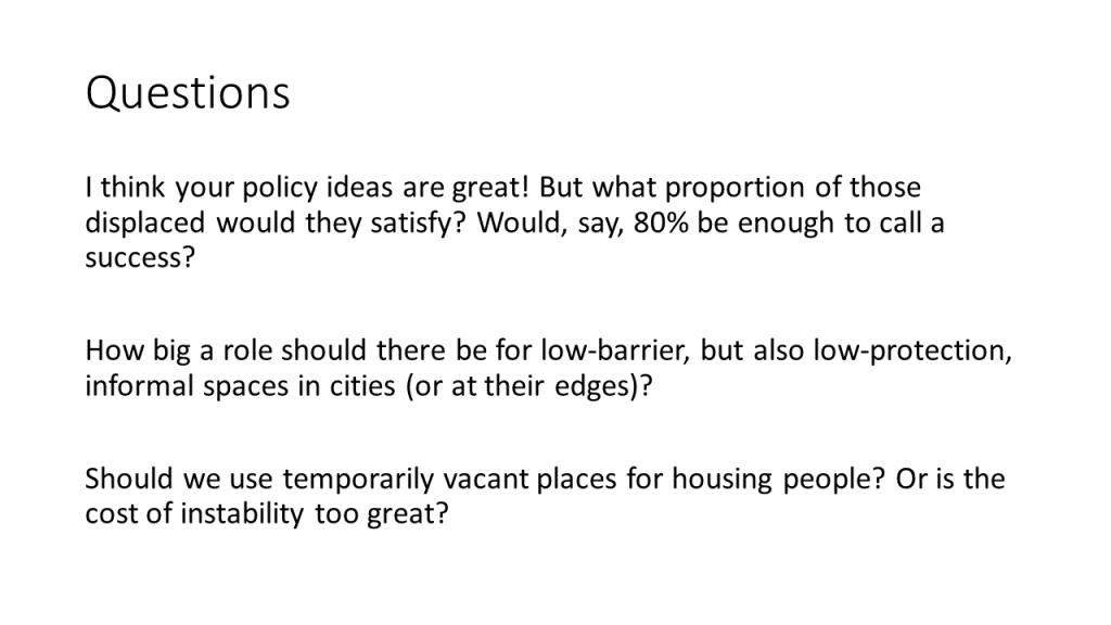 My first substantive slide drew attention to a comment at the end of the book about the right to housing (which I’d recently been exploring as an orientation for YIMBY activism), unfavorably comparing the USA to other countries. There’s a tendency sometimes to overlook other countries’ issues and problems in critiquing our own, so here I just wanted to point out that Canada’s “guarantee” of a human right to housing is not so guaranteed.