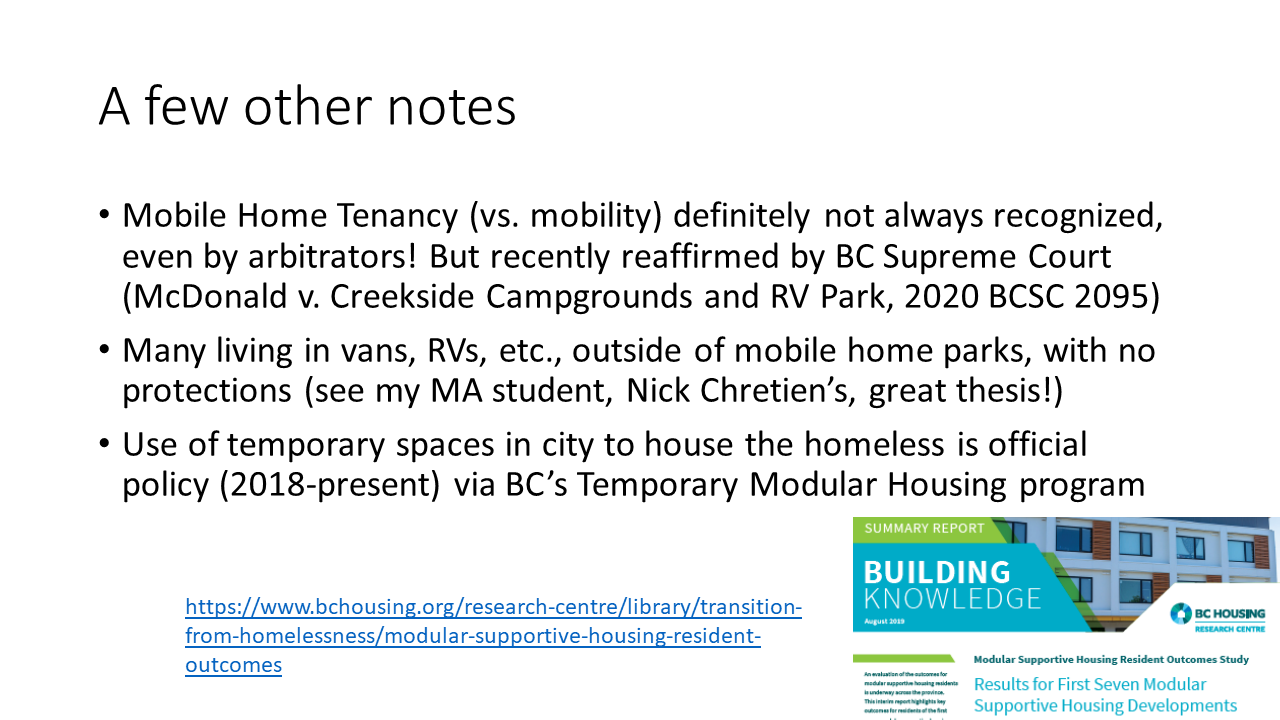 I noted a few other relevant issues, including a recent court case affirming tenant rights for RV owners in BC, Nick Chretien‘s thesis on informal van and RV living around Vancouver (successfully defended just weeks later, and soon to be posted free on-line!), and Vancouver’s Temporary Modular Housing program.