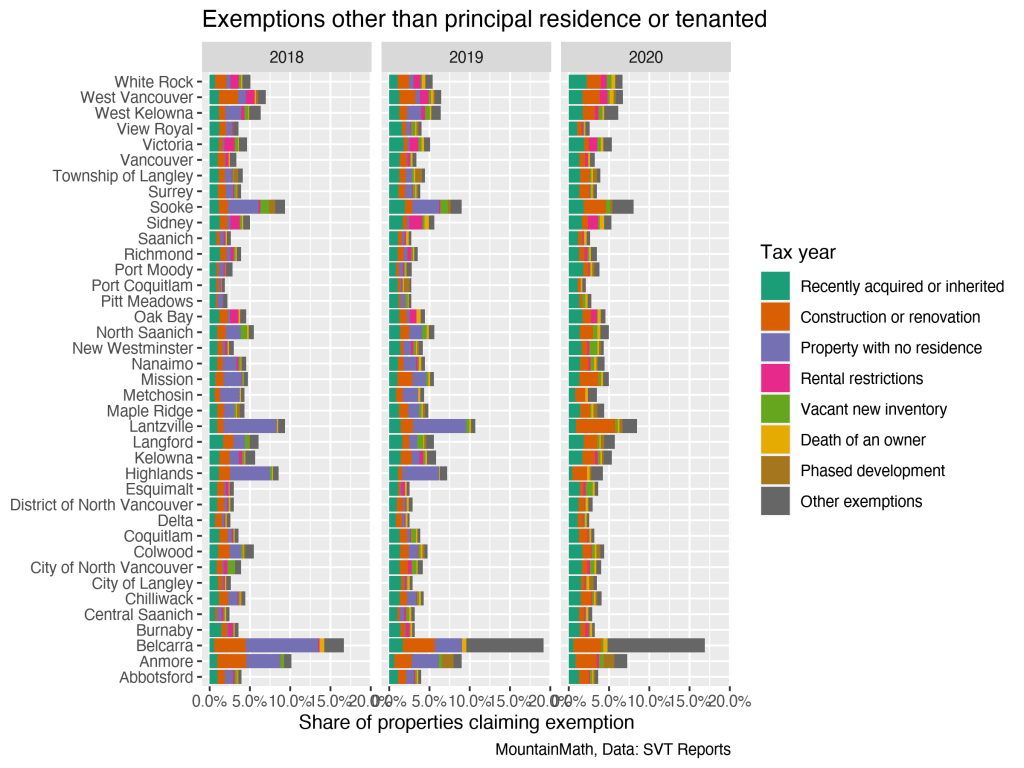 Finally we demonstrate the range of other exemptions provided to the Speculation and Vacancy Tax. The list of exemptions is long, we will focus on the most common exemptions across all municipalities. The way the data is organized means that the “Other exemptions” category is unique to each municipality and contains all exemptions that aren’t shown in the graph for the respective municipality. For instance, in Belcarra, many properties are deemed exempt because they’re only accessible by water.