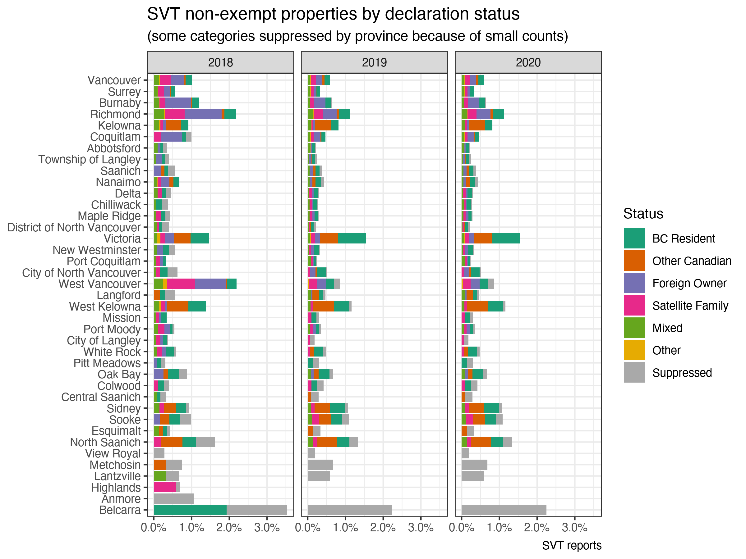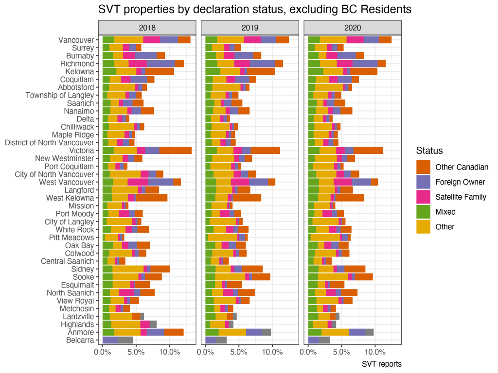 There is a bit of variation across municipalities, ranging from under 5% to over 10% of properties owned by other than a “BC Resident” as defined by the SVT, but things stay within the expected range and shares are surprisingly stubborn across the years. Of these, only a small fraction actually pay the SVT as can be seen in the next graph, now also including BC Residents.