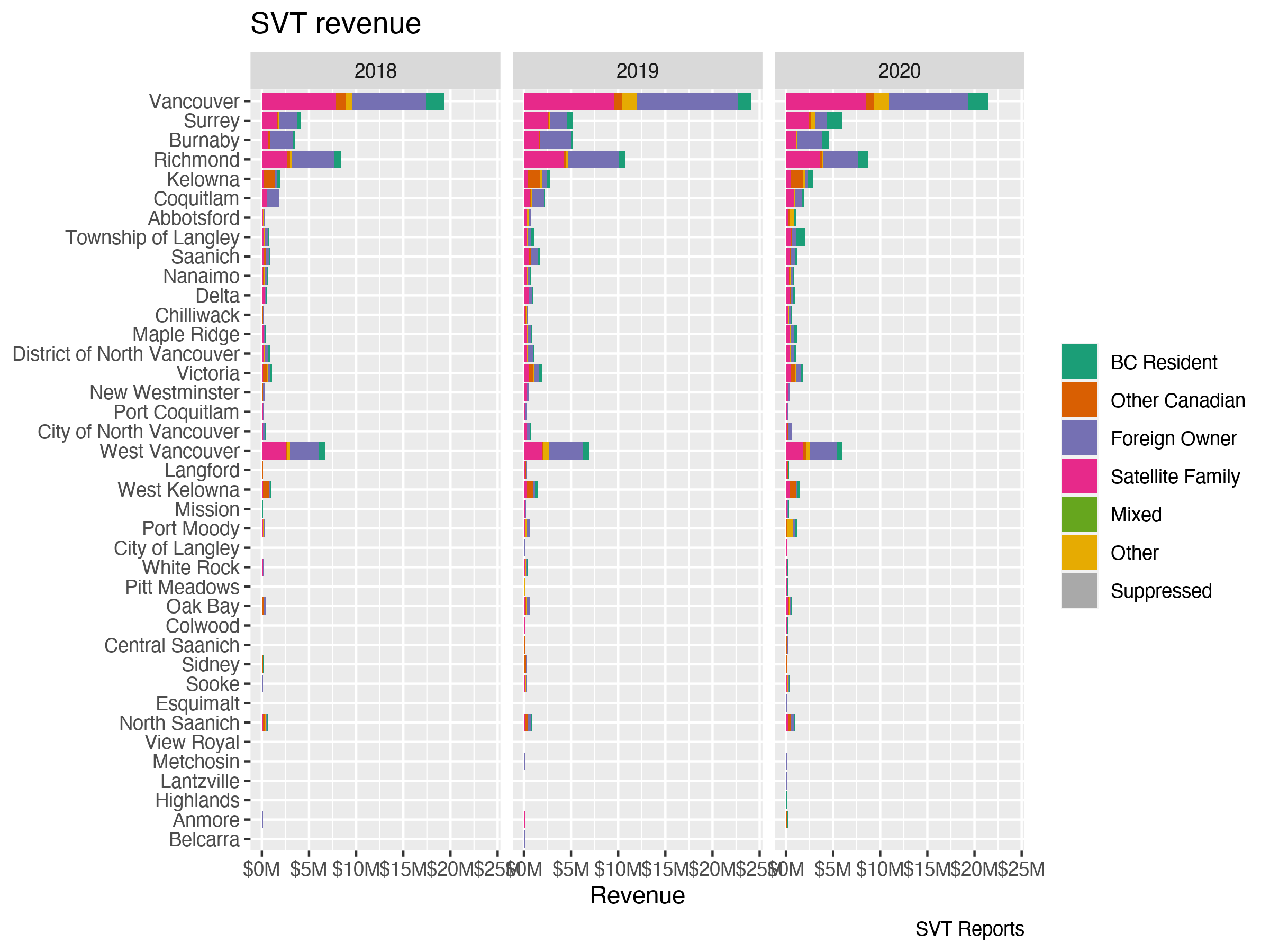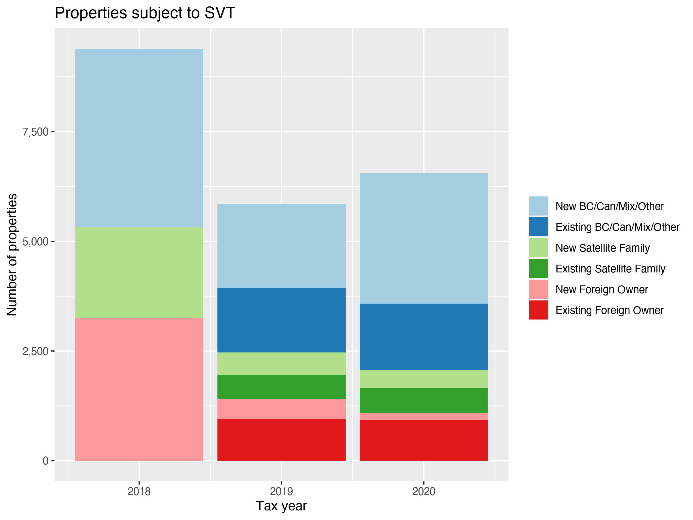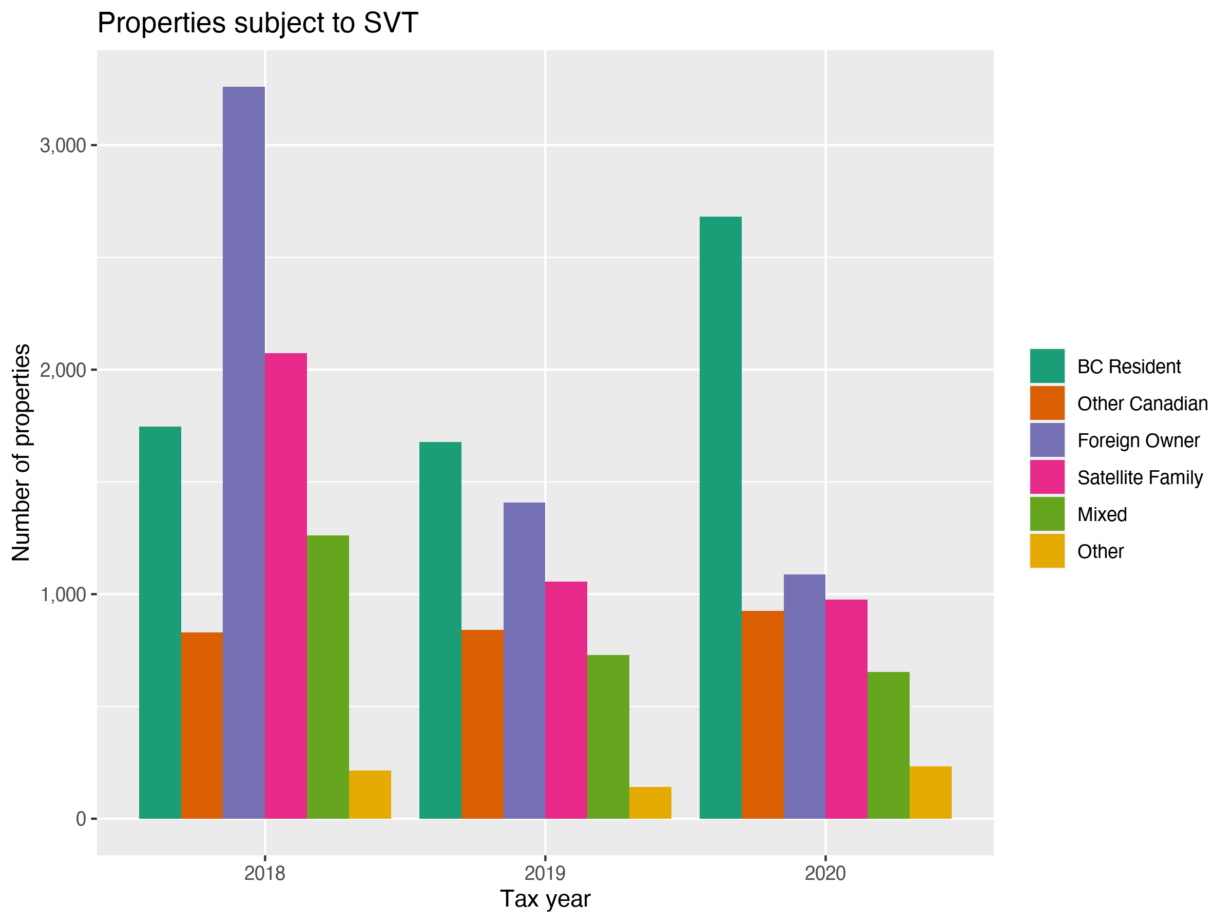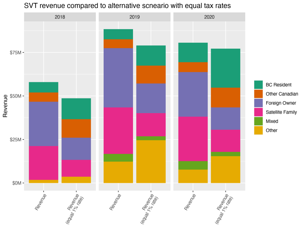 Flows demonstrate other interesting changes over time. Perhaps surprisingly, only a minority of properties remain persistently subject to taxation between years. But new properties are added to SVT taxation at the same time as most properties from the previous year are removed. In short, there’s substantial fluctuation in tax incidence. This has compositional effects. In particular, it appears that Foreign Owned properties and Satellite Family properties have gradually diminished to a smaller, but relatively stable low level. Between 2018 and 2020, they seem to have been largely replaced by Other properties, mostly owned by residents of BC and other parts of Canada. For the most recent year, a cynical read might suggest that the SVT simply replaced higher-taxed Foreign owners of empty homes with lower-taxed Canadian owners of empty homes.