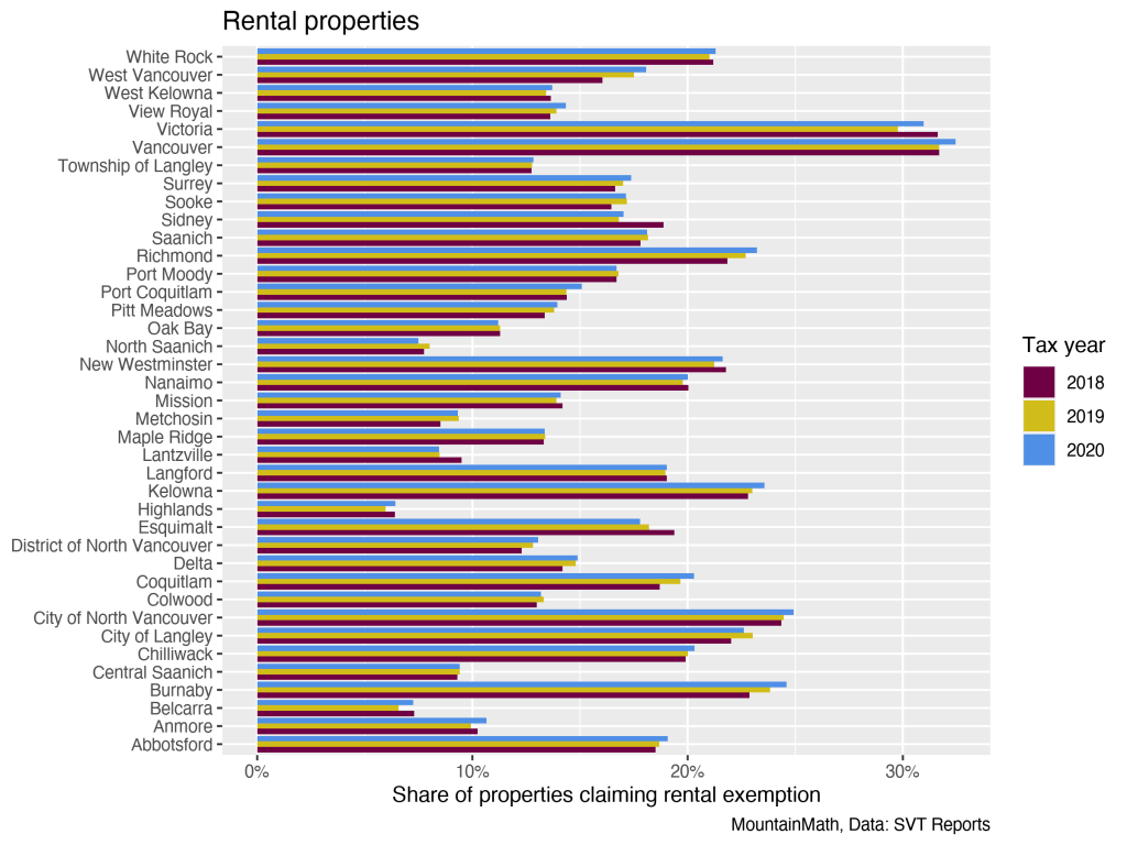 Another often touted aspect of the Speculation and Vacancy Tax is the return of housing to the rental market. As we’ve often noted, this is definitely a potential benefit of vacancy taxes! They add pressure to owners of empty dwellings to rent them out while not in use or between sales. As we’ve noted before, there are multiple ways to attempt to see the relationship between the SVT and rentals. The simplest is to simply look at changes over time in Tenancy Exemptions. Unfortunately, we’re missing the information about tenancy prior to the imposition of the SVT that would be most helpful in assessing its full effects. But we can see how increasing proportions of properties are being rented out over time, as demonstrated via tenancy exemption to the SVT, in larger cities including Vancouver, Burnaby, and Richmond. This fits especially well with what we know about condominiums, insofar as they’re a major source of secondary market rental stock across BC.