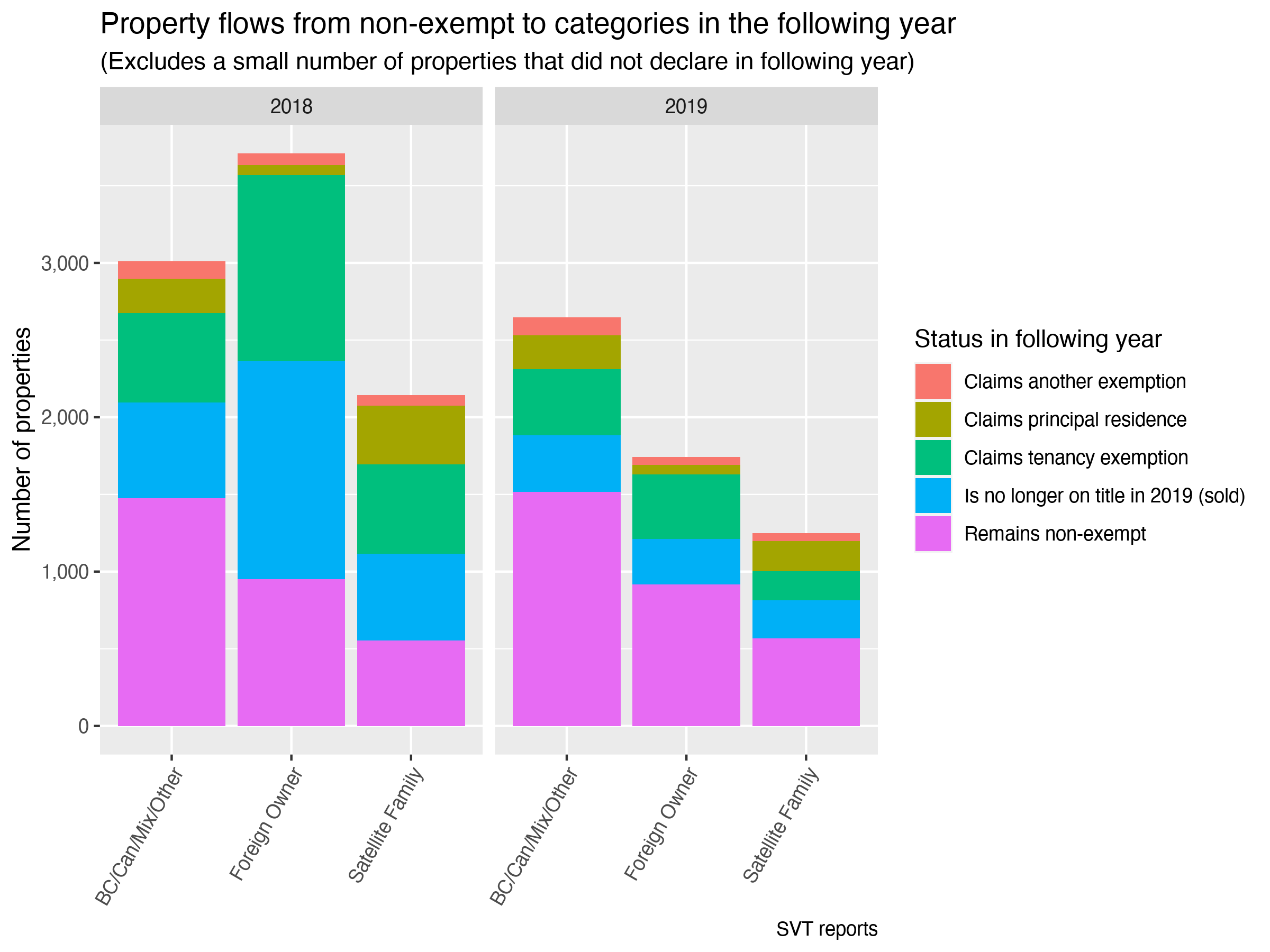 We can also look more broadly at the declaration status of the 2018 and 2019 SVT properties in the following year, checking in which way SVT properties moved out of the SVT tax paying stock.
