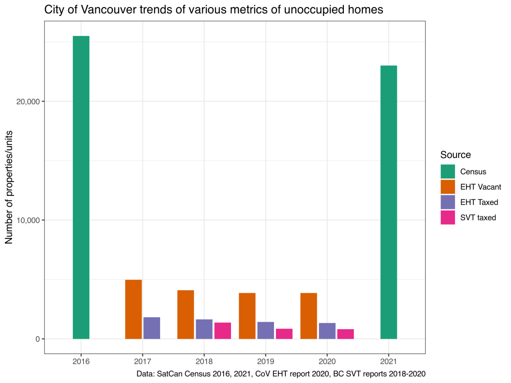 Looking just at raw numbers, it looks like instead of 1-in-8 unoccupied hit with a tax, we get closer to 1-in-12 when the Empty Homes Tax first when into effect in 2017 (matched to 2016 Census), dropping to more like 1-in-15 by 2020 (matched to 2021 Census). For the Speculation and Vacancy Tax, the figures are even lower, declining to one property taxed in 2020 for every twenty-eight dwellings showing up as unoccupied by usual resident in 2021. (It appears to us that the difference between SVT taxed and EHT taxed is largely explained by different reporting standards emphasizing only properties declared as empty for SVT data vs. properties declared, determined, or deemed to be vacant in the EHT data.)
